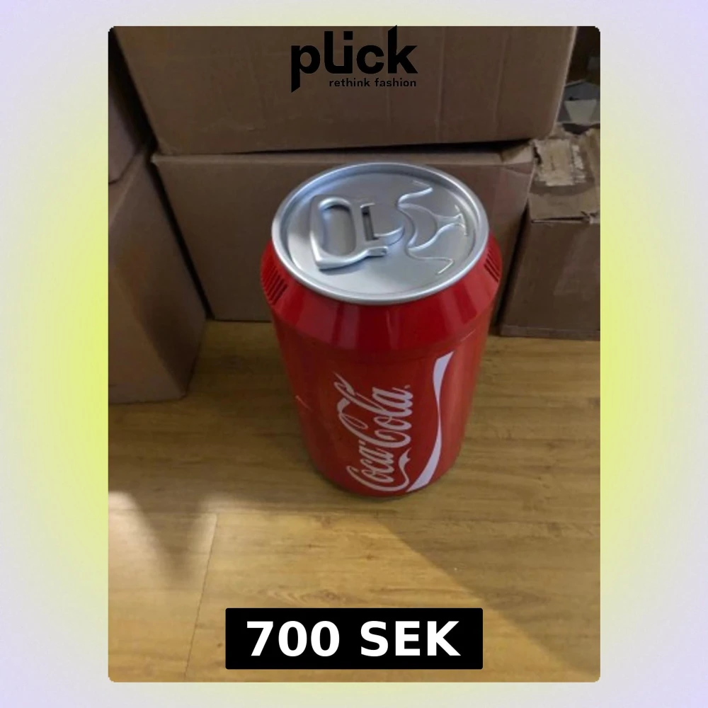 Säljer en röd minikyl i form av en Coca-Cola burk. Kylen har ett silverfärgat lock, vit Coca-Cola-logga och ett hyllplan inuti. Perfekt för att förvara drycker eller snacks. Tillverkad i plast och metall.