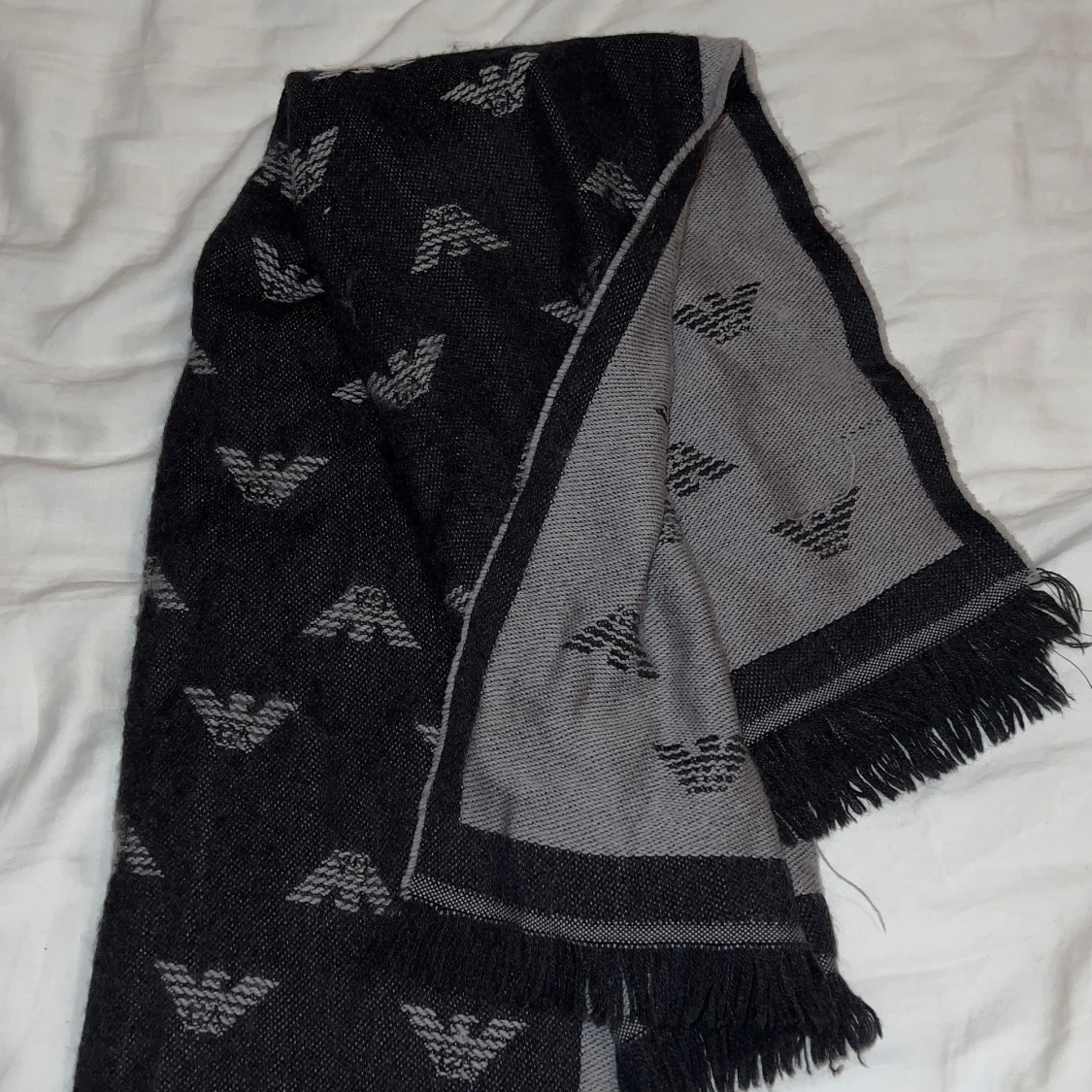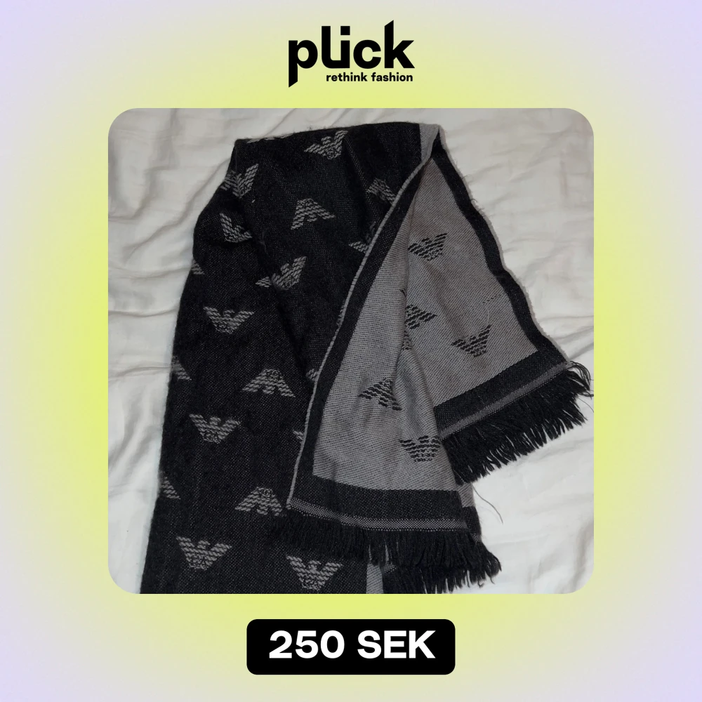 Snygg och stilren halsduk från Emporio Armani i svart och grått. Den har ett diskret mönster med märkets logotyp och fransar i ändarna. Perfekt för att hålla sig varm och trendig under kyliga dagar.
