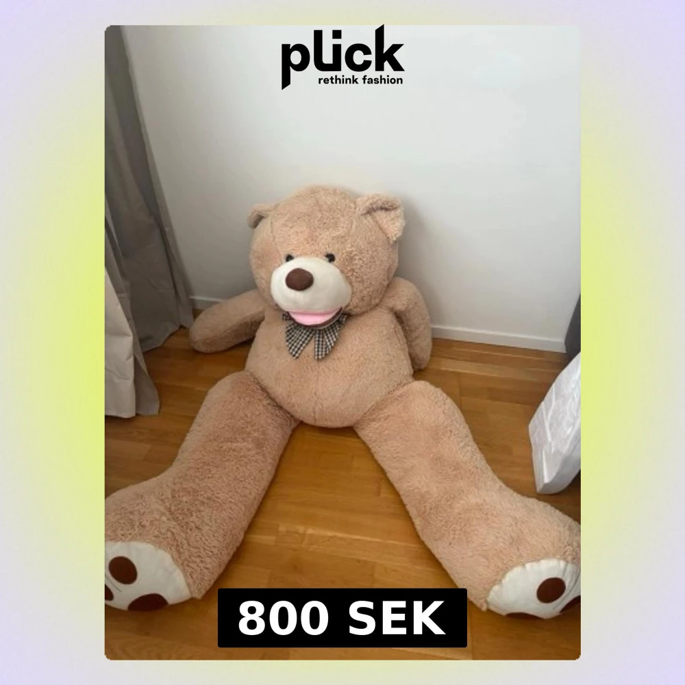 Gigantisk mjuk nallebjörn i beige plysch med vit nos, bruna detaljer på tassarna och en brunvitrutig rosett runt halsen. Perfekt som mysig inredningsdetalj eller present till någon du gillar. Den är 160 cm. Nypris 1800