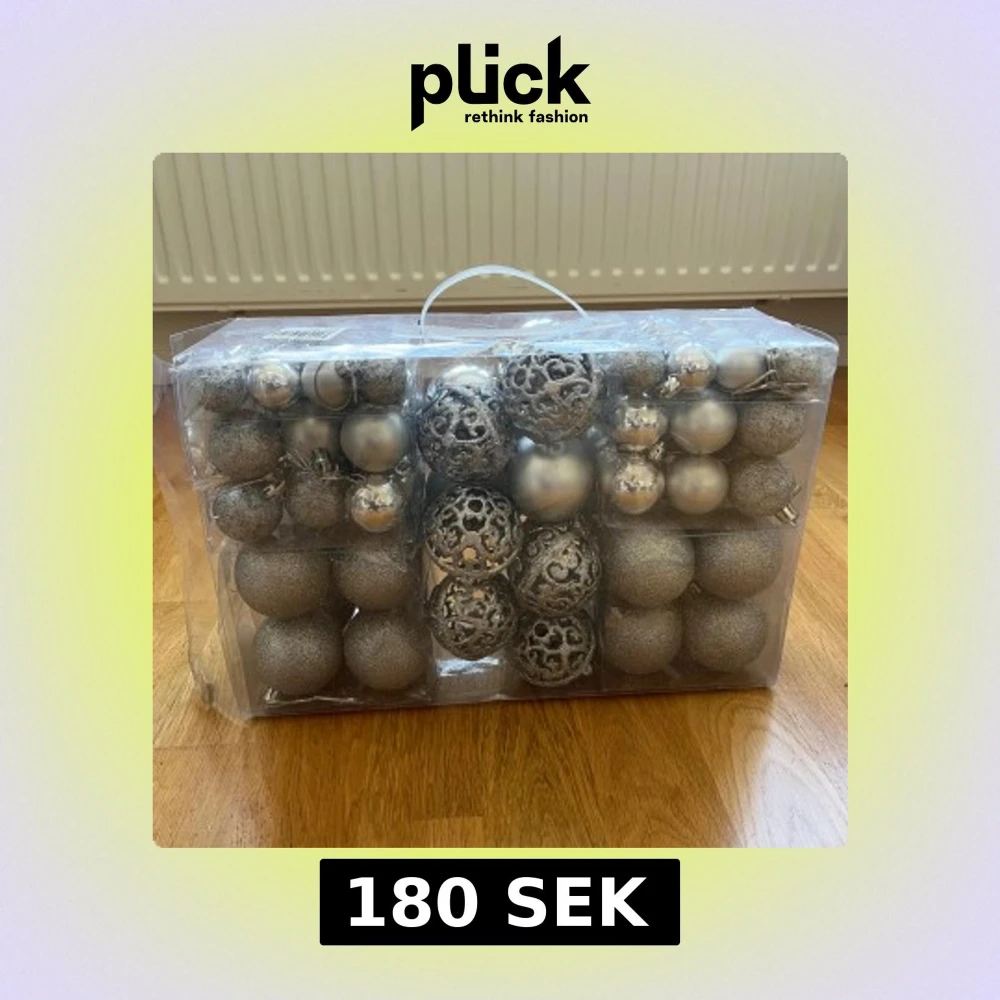 Stort set med silverfärgade julgranskulor i olika utföranden, inklusive glittriga och ornamenterade bollar. Levereras i praktisk plastförpackning med handtag. Några kulor har mindre bucklor som går att trycka ut jag har bara inte orkat det, annars i gott skick och redo för dekoration. Är endast använda en jul för 3 årsedan efter det har de stått i förvaring. Är ca 100st och nypris är 400:-