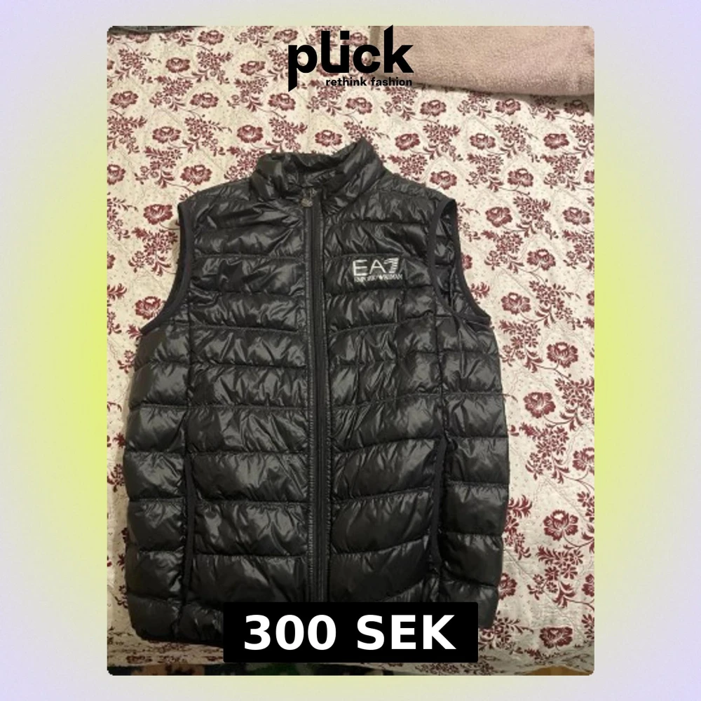 Säljer en svart dunväst från Emporio Armani EA7. Västen har quiltad design, hög krage och dragkedja framtill med EA7-logga på bröstet. Tillverkad i glansig polyester som ger en modern look. Perfekt att slänga över en hoodie eller tröja storlek s.