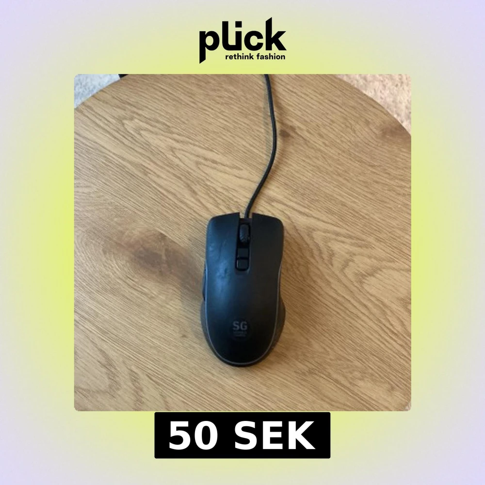 Säljer en svart datormus från SG med sladd. Musen har en enkel och stilren design med två knappar och ett scrollhjul. Perfekt för både arbete och spel.