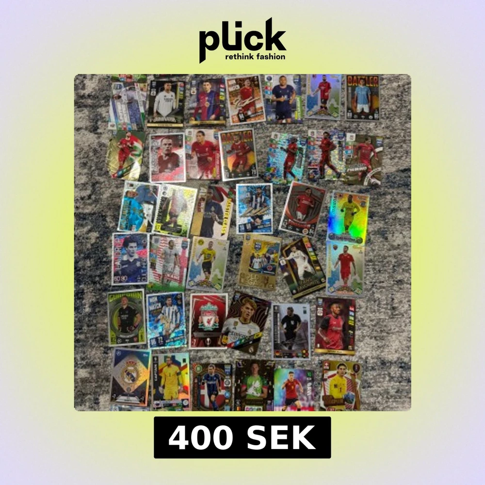 Stor samling av fotbollskort med olika spelare och lag. Inkluderar kort från Liverpool FC, Manchester City och andra kända klubbar. Perfekt för samlare eller fotbollsfans som vill utöka sin kollektion.