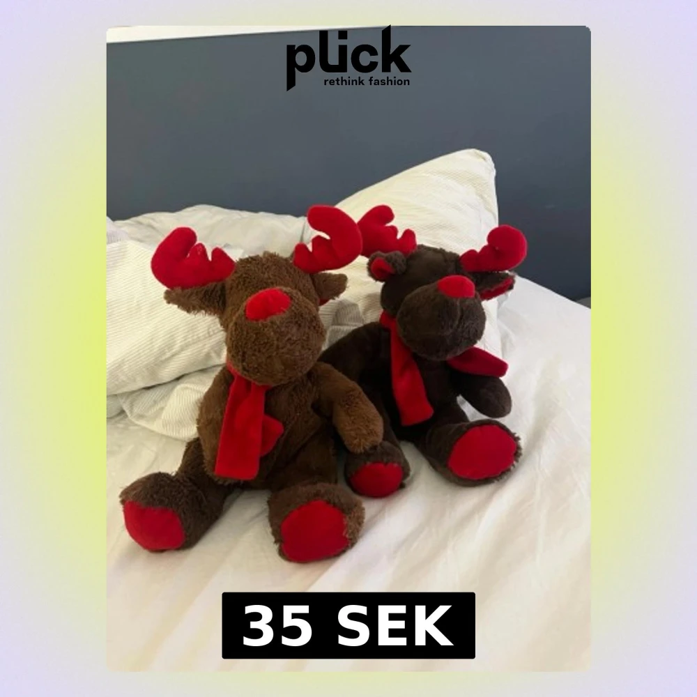 Säljer två söta ren-gosedjur i mjuk plysch, en ljusbrun och en mörkbrun. Båda har röda horn, nos, halsduk och tassar. Perfekta som juldekoration eller present. Klassisk rund form och mysigt material.