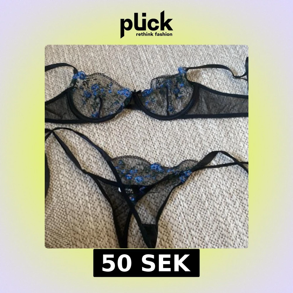 Säljer en svart korsett med transparent spets och blå broderade blommor. Toppen har tunna axelband och vacker broderad detalj framtill. Perfekt för dig som gillar romantisk och edgy stil.