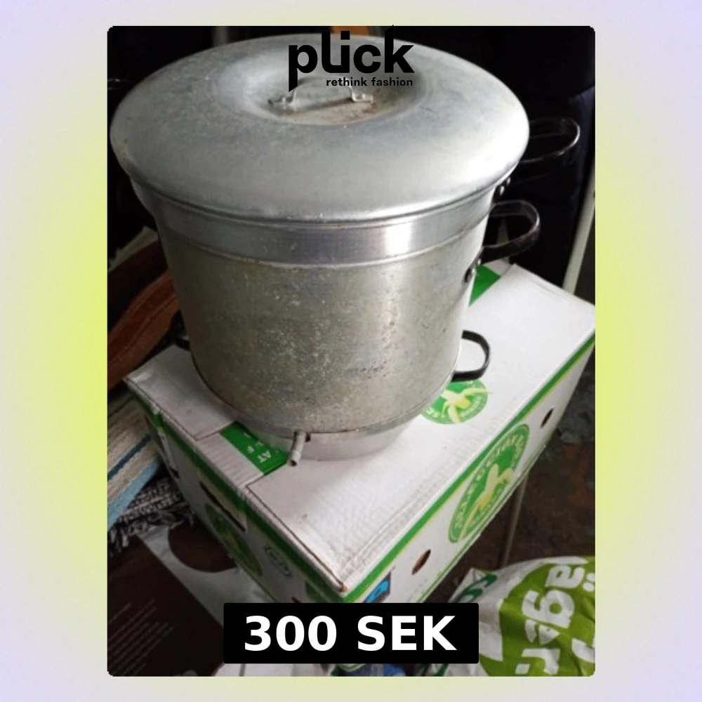 Säljer en rejäl aluminiumgryta med lock och två svarta handtag på sidorna. Grytan har även en liten pip längst ner för avtappning. Perfekt för större matlagning eller bryggning hemma.