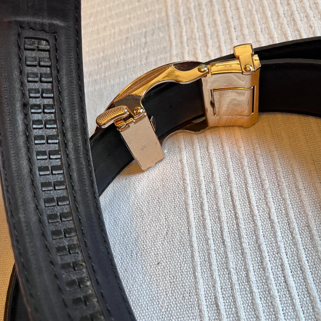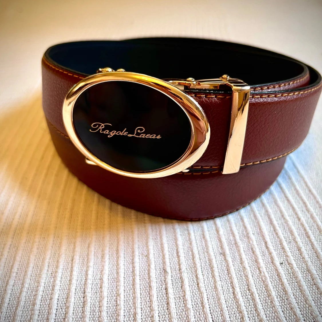 Snyggt och brett brunt bälte från Ragole Lacas med exklusivt svart och guldigt spänne. Bältet är gjort i skinn och har dekorativa sömmar längs kanterna. Insidan är svart och spännet har en lyxig känsla med ovalt format och guldfärgade detaljer.