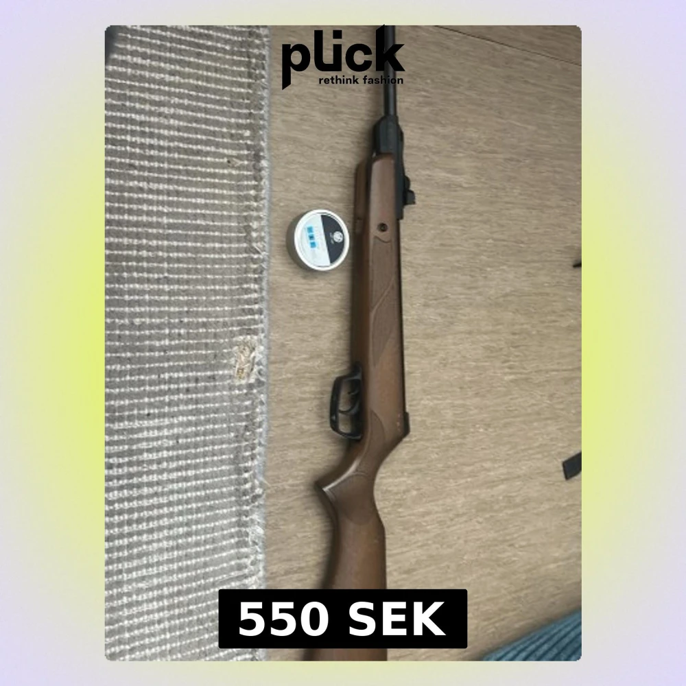 Säljer ett luftgevär med klassisk brun trästock och svart pipa. Geväret har ett enkelt sikte och medföljer en burk luftgevärskulor. Perfekt för dig som gillar skytte på fritiden.