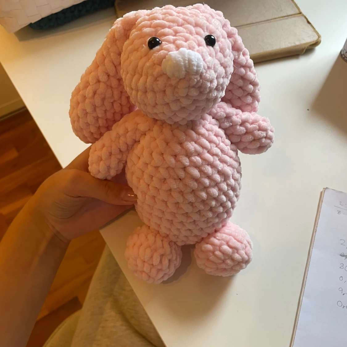 Bilderna visar en söt, handvirkad rosa kanin i mjukt garn. Detta är en gosedjur/leksak som man även kan ha som prydnad. Gemför storlek med min hand