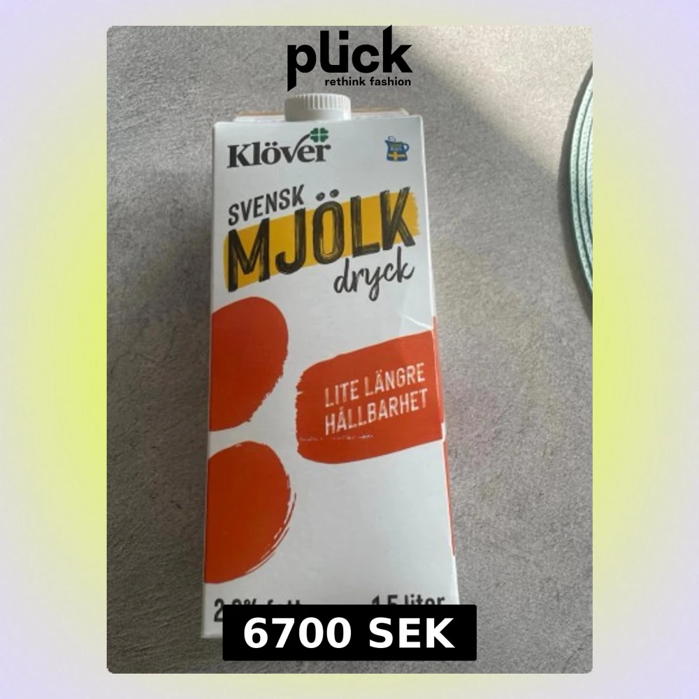 En förpackning Klöver svensk mjölkdryck med 2,6% fett och lite längre hållbarhet. Kartongen är vit med orange och gul text, rymmer 1,5 liter och har skruvkork. Produkten är tillverkad av filtrerad mjölk från svenska gårdar.
