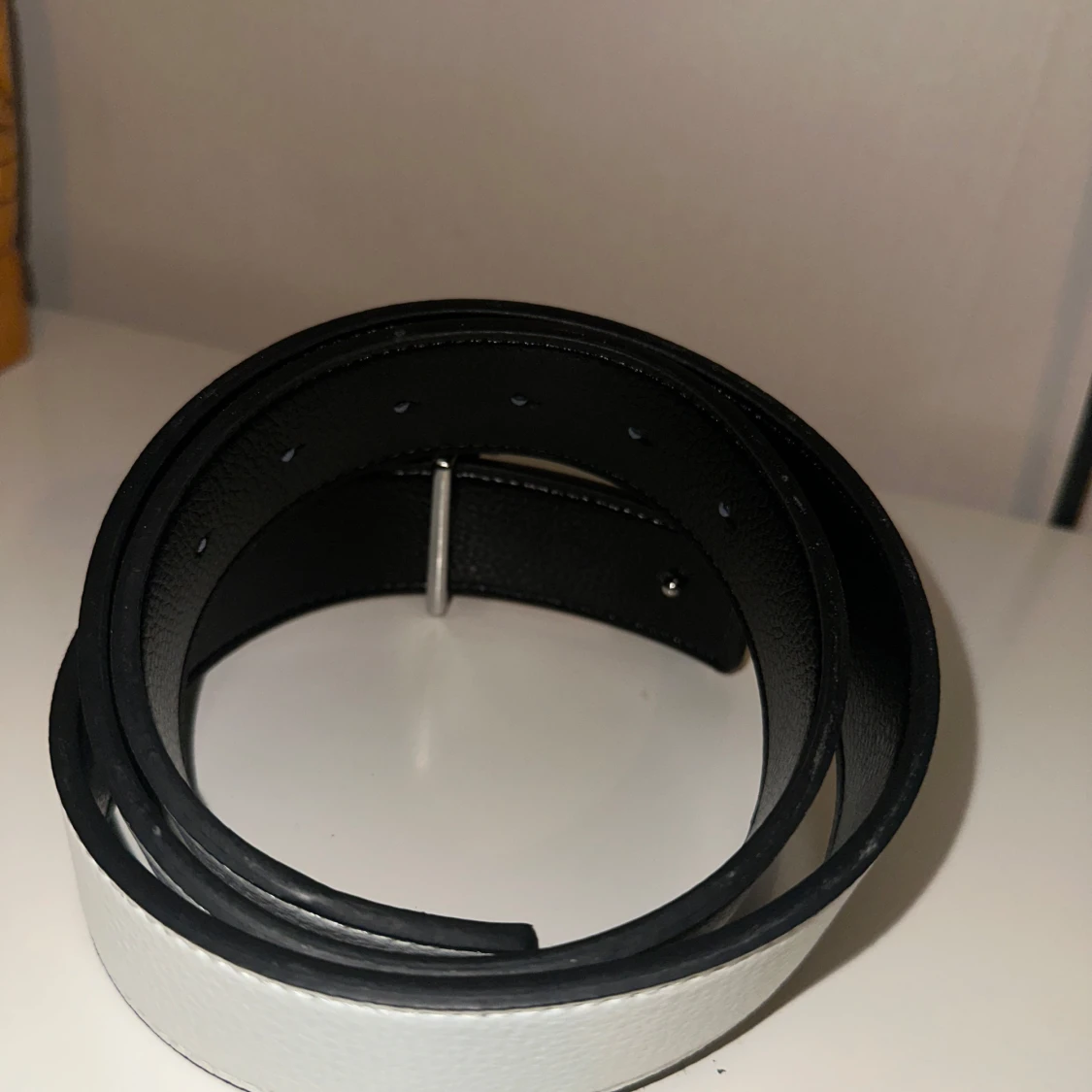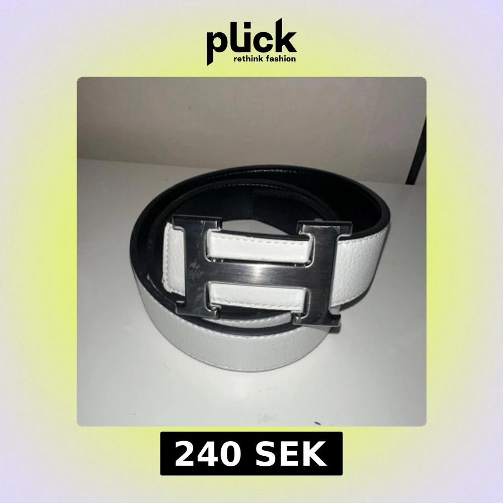 Säljer ett stilrent vitt bälte från Her-més med ett stort, silverfärgat H-spänne. Bältet är gjort i skinn och har en svart insida. Perfekt accessoar för att lyfta din outfit. 100cm