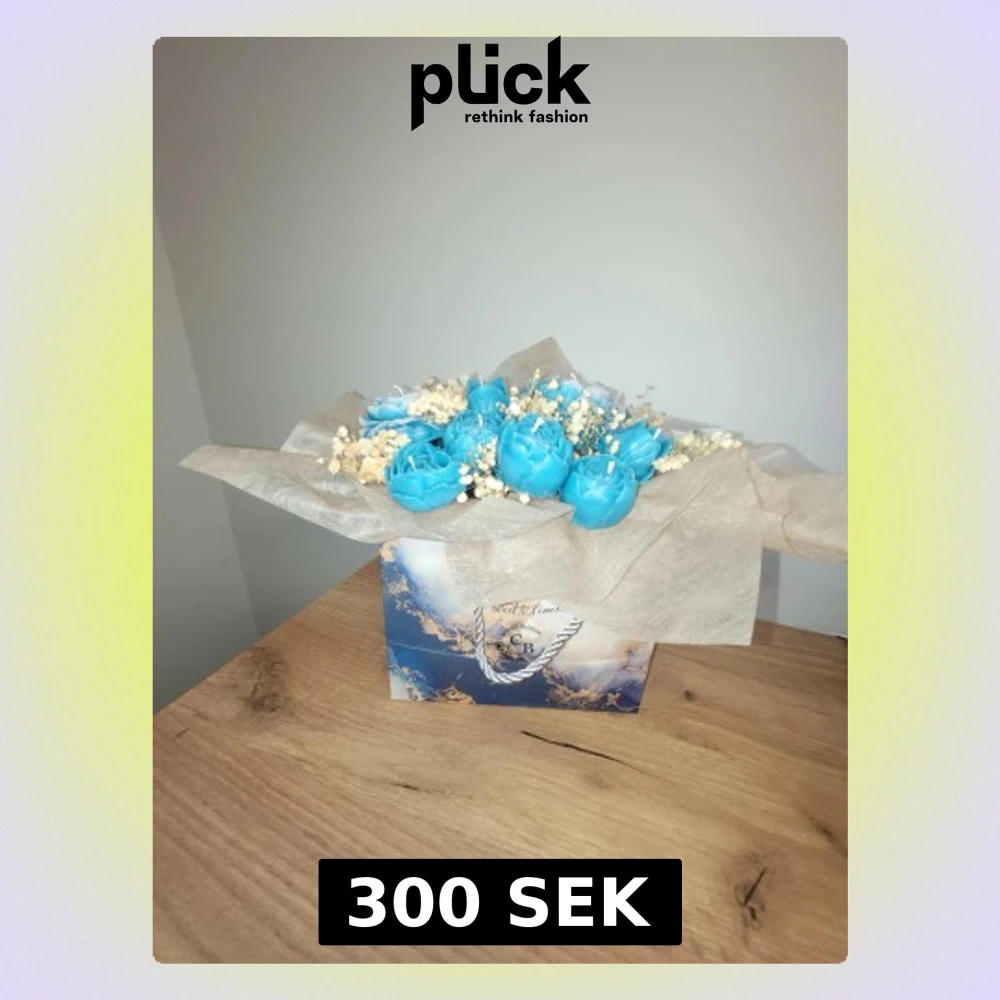 Unik presentpåse fylld med handgjorda blå och vitblå blomformade ljus, dekorerade med torkade beige blommor. Ljusen har detaljerade kronblad och ger en cool vibe till rummet. Perfekt som dekoration eller gåva till någon du vill överraska.