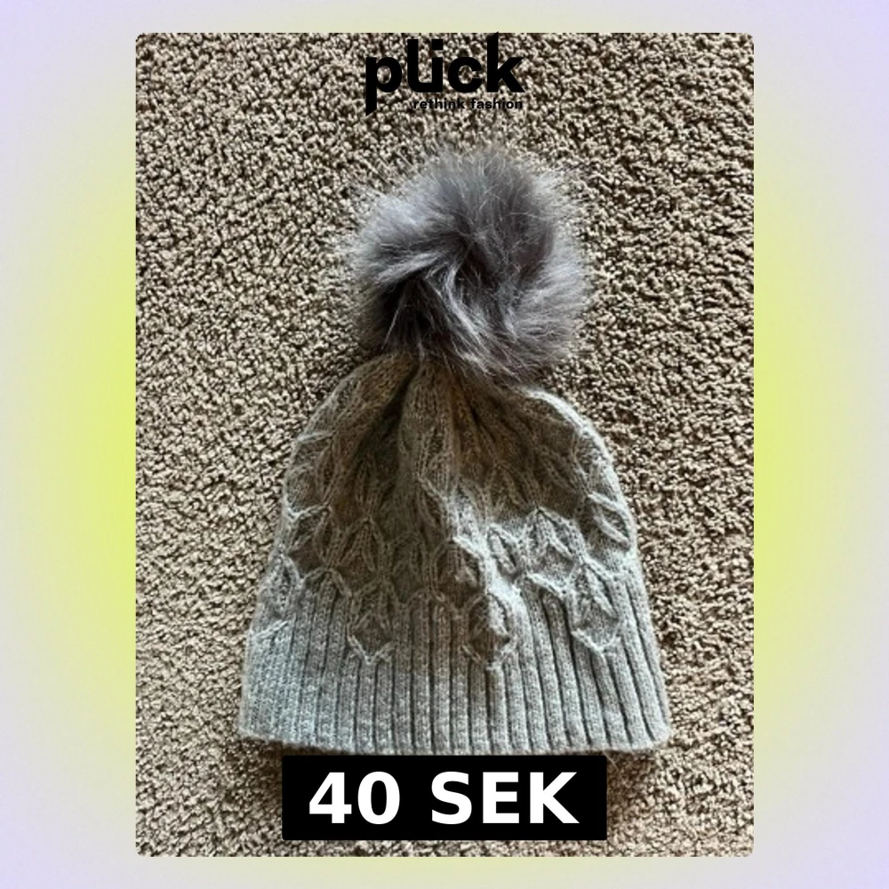 Säljer en snygg grå stickad mössa med ett mönstrat strukturstickat parti och en stor fluffig pälsboll på toppen. Mössan har bred ribbad kant och är perfekt för kalla dagar. Passar dig som vill ha både stil och värme.