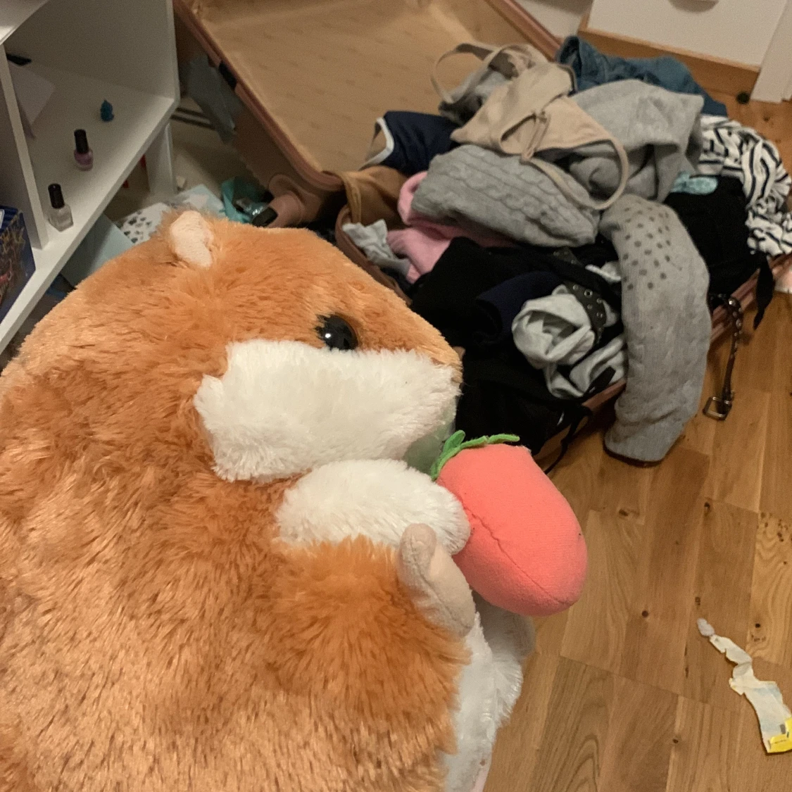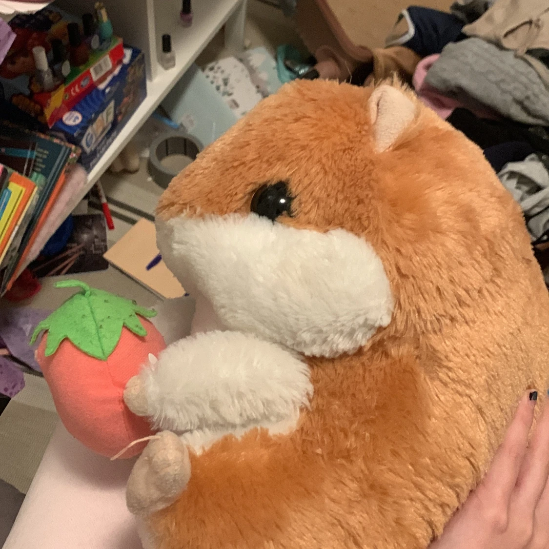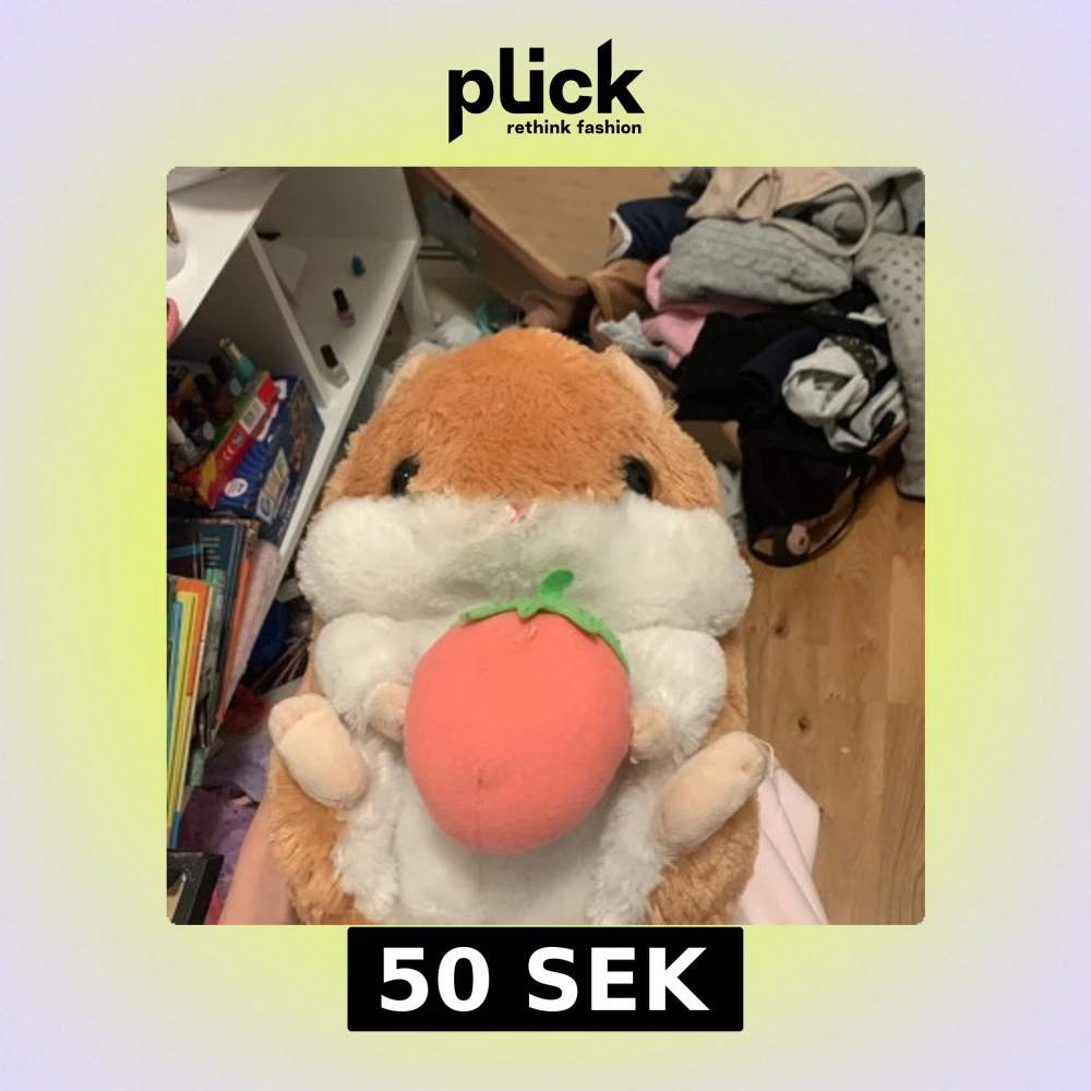 Supermjuk och söt hamster-gosedjur från Amufun, håller en rosa jordgubbe. Fint skick, inga synliga fläckar eller skador förutom en tråd som fanns där när jag köpte gosedjuret. Perfekt som present eller mysig inredningsdetalj. Ca 30 cm hög, tillverkad i mjuk plysch. Märkt med originaletikett.