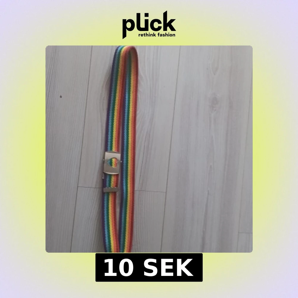 Säljer ett färgglatt bälte med regnbågsränder och ett unikt hjärtformat spänne i silver. Perfekt för att lägga till en pop av färg till din outfit.