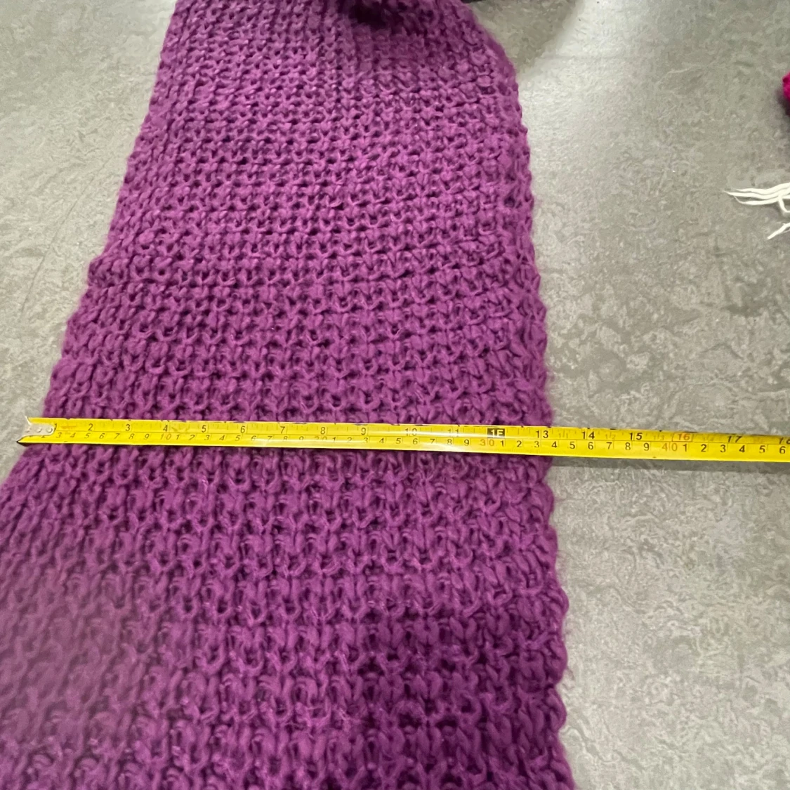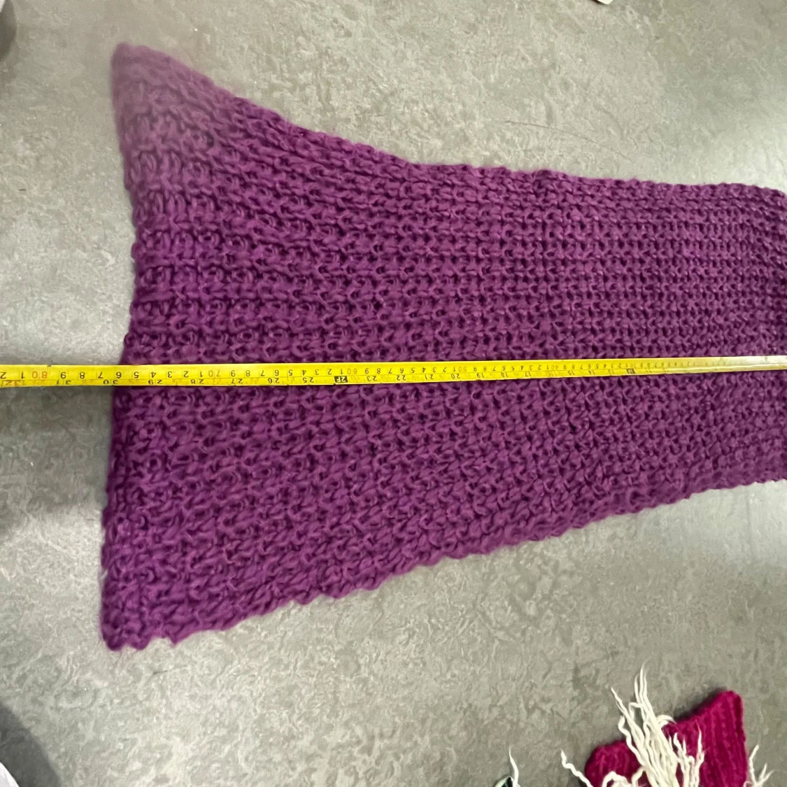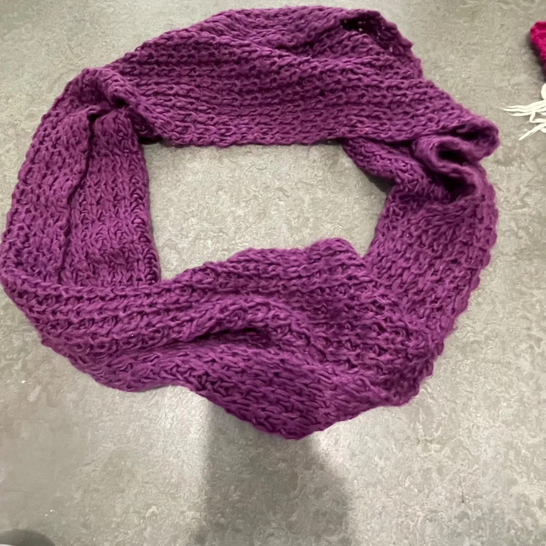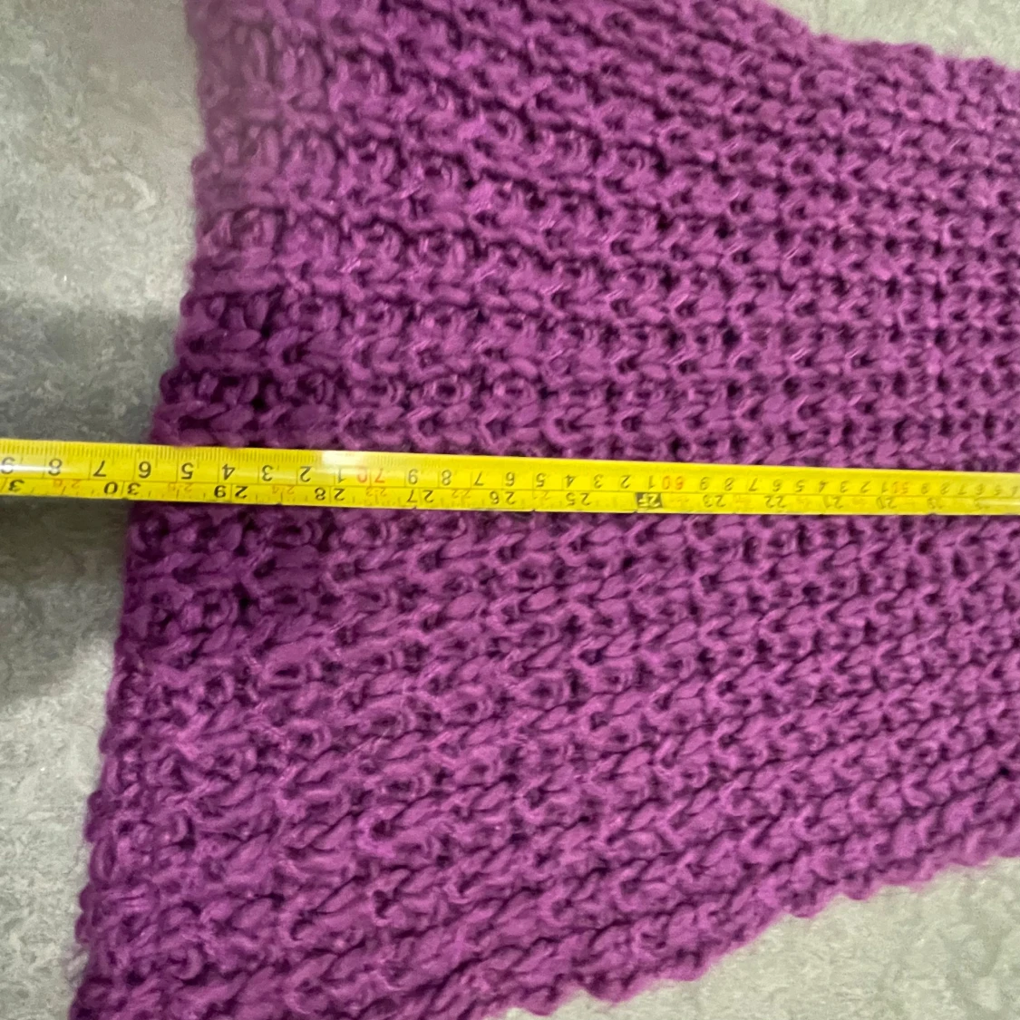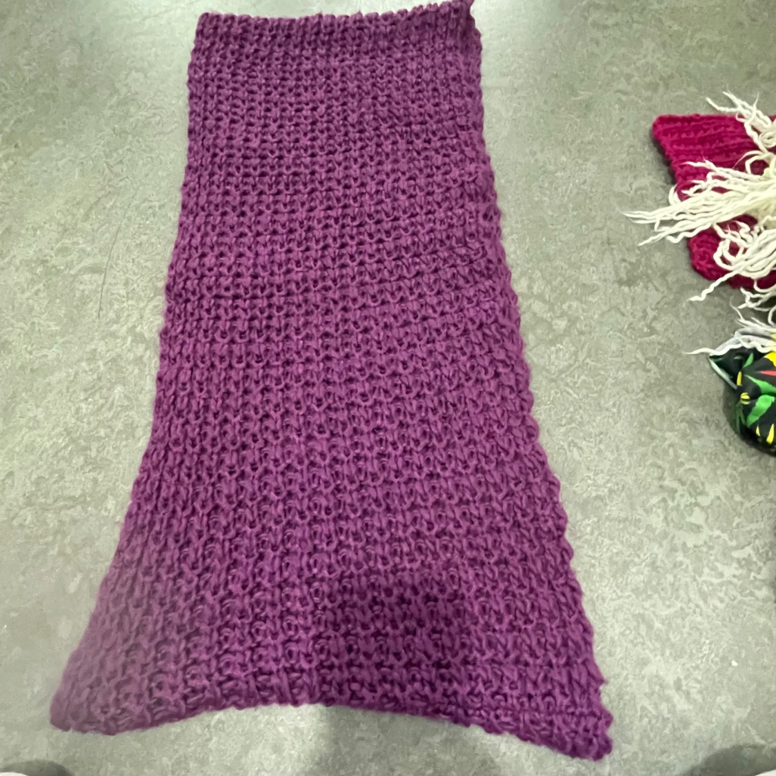Mysig och chunky lila halsduk i grovstickat garn. Halsduken är rektangulär och extra bred, perfekt att vira flera varv runt halsen för maximal värme. Färgen är en djup lila som verkligen poppar och passar perfekt till kalla dagar.