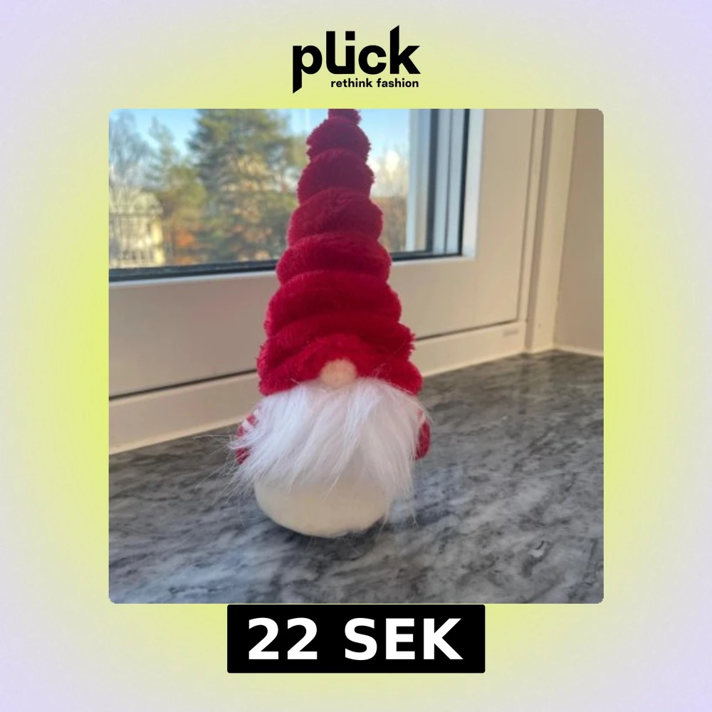 En väldigt fin tomte med spiralfomad röd tomteluva i mjuk plysch, perfekt för julens alla tillfällen. Tomten är lång och konformad med tydlig struktur och passar utmärkt till dekoration.