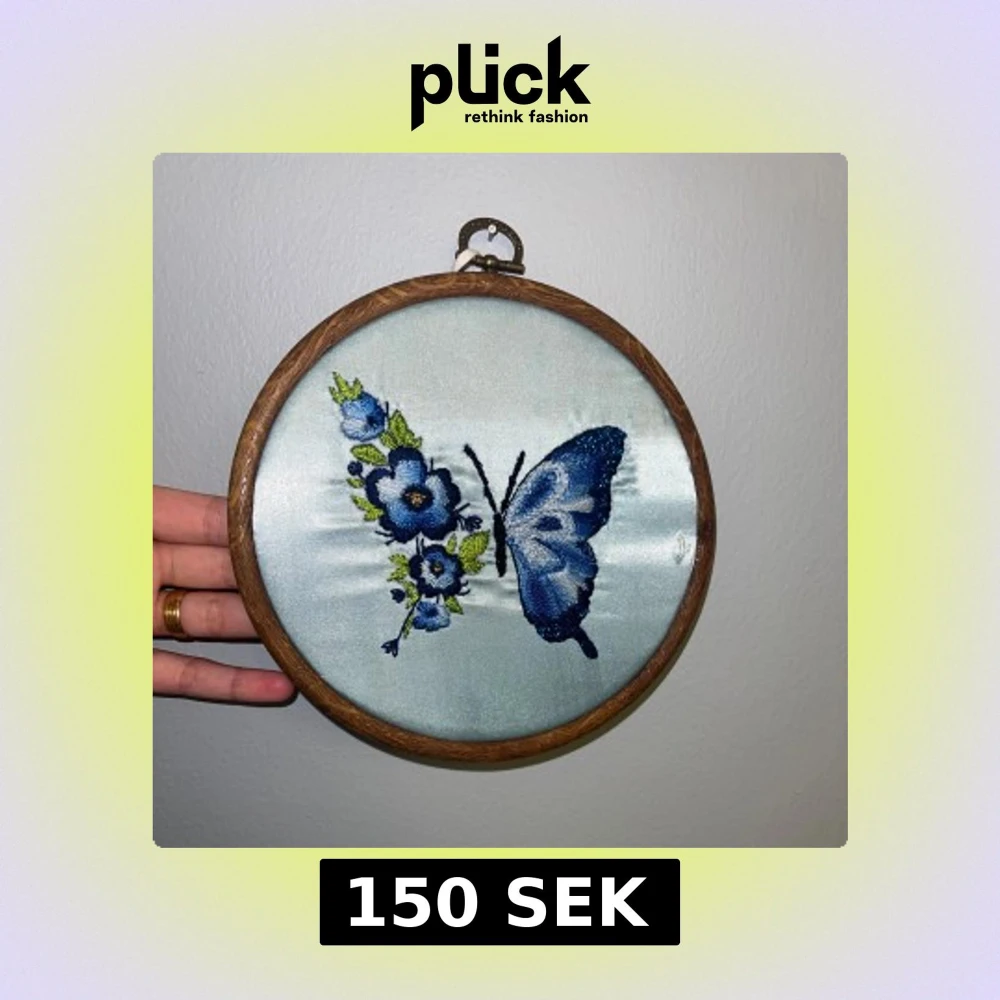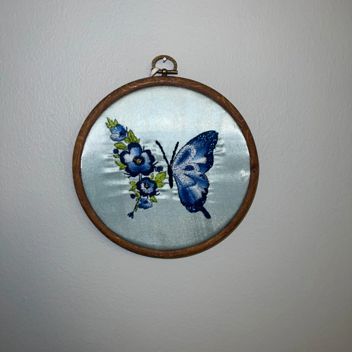 En handbroderad fjäril tavla av mig säljes till någon som uppskattar handarbeten och supportar det. Tavlan kan hängas som dekor.