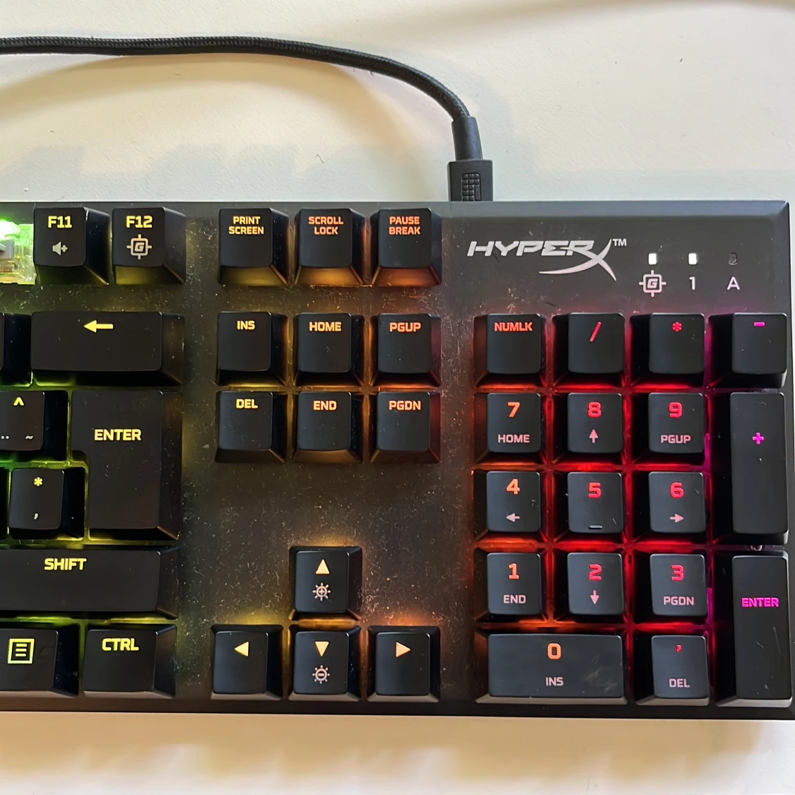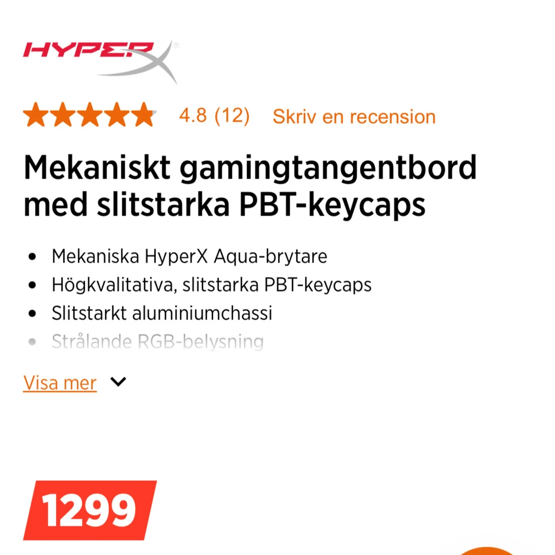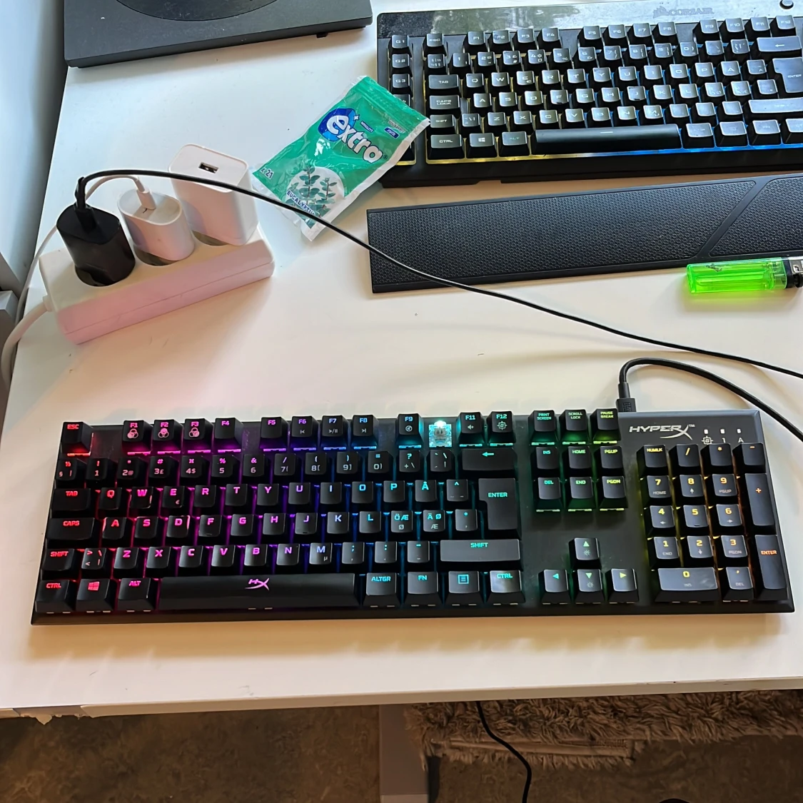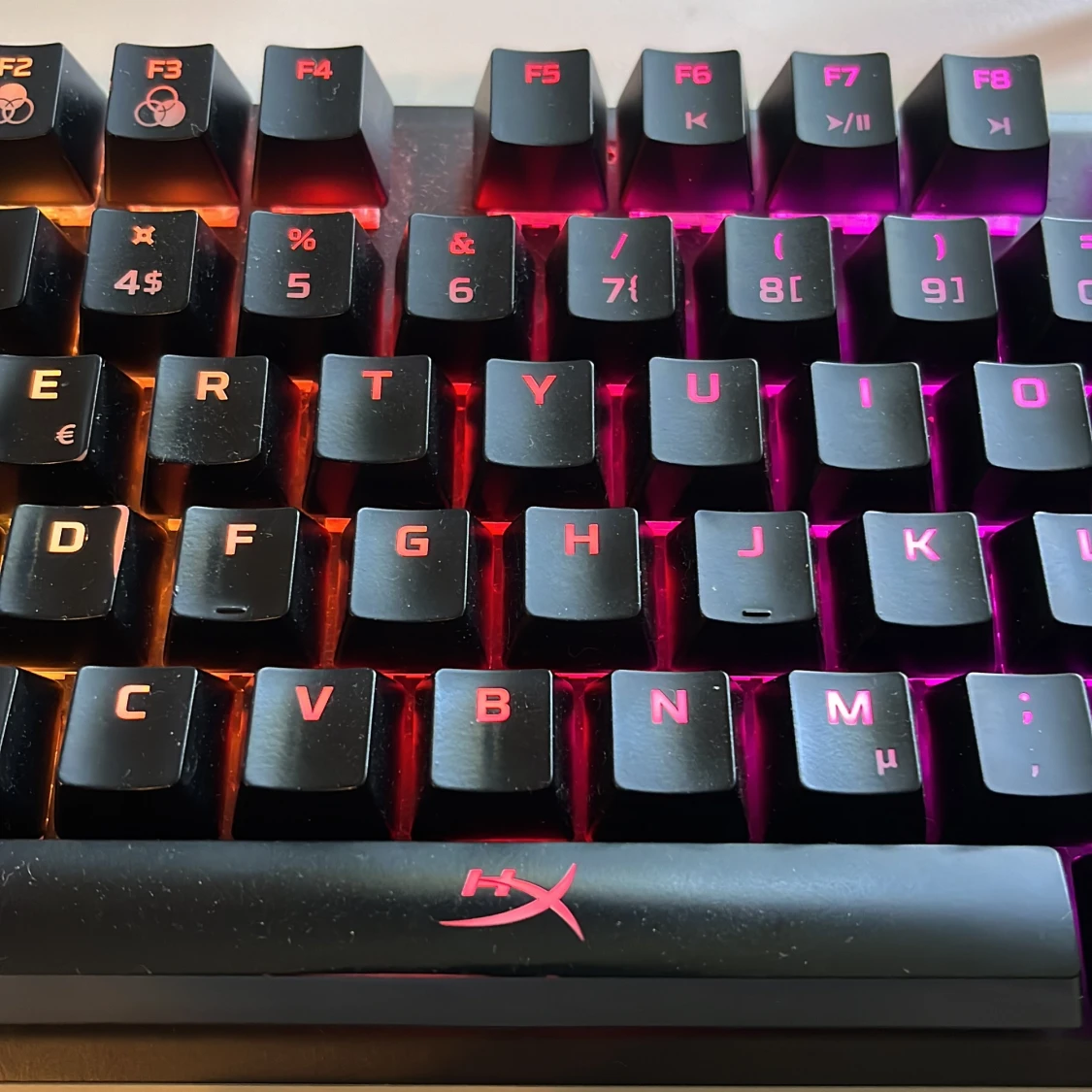 HyperX Alloy FPS RGB är ett mekaniskt tangentbord med färgglad RGB-belysning och robust design. Perfekt för gaming och skrivande, med responsiva tangenter och numerisk del. Passar dig som vill ha stil och prestanda vid datorn. En Knapp saknas ska leta efter den, Annars fungerar felfritt bara att ibland kan den upprepa sig på F knappen , Lite dammig då jag inte använt den i nåra veckor nu.
