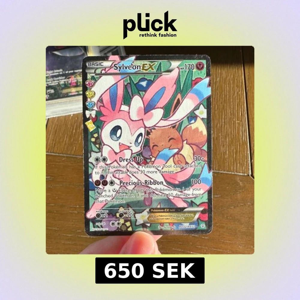 Säljer ett Sylveon EX Pokémonkort med 170 HP. Kortet har färgglada illustrationer av Sylveon och Eevee. Det har attacker som Dress Up och Precious Ribbon. Perfekt för samlare eller spelare som vill stärka sin kortlek.