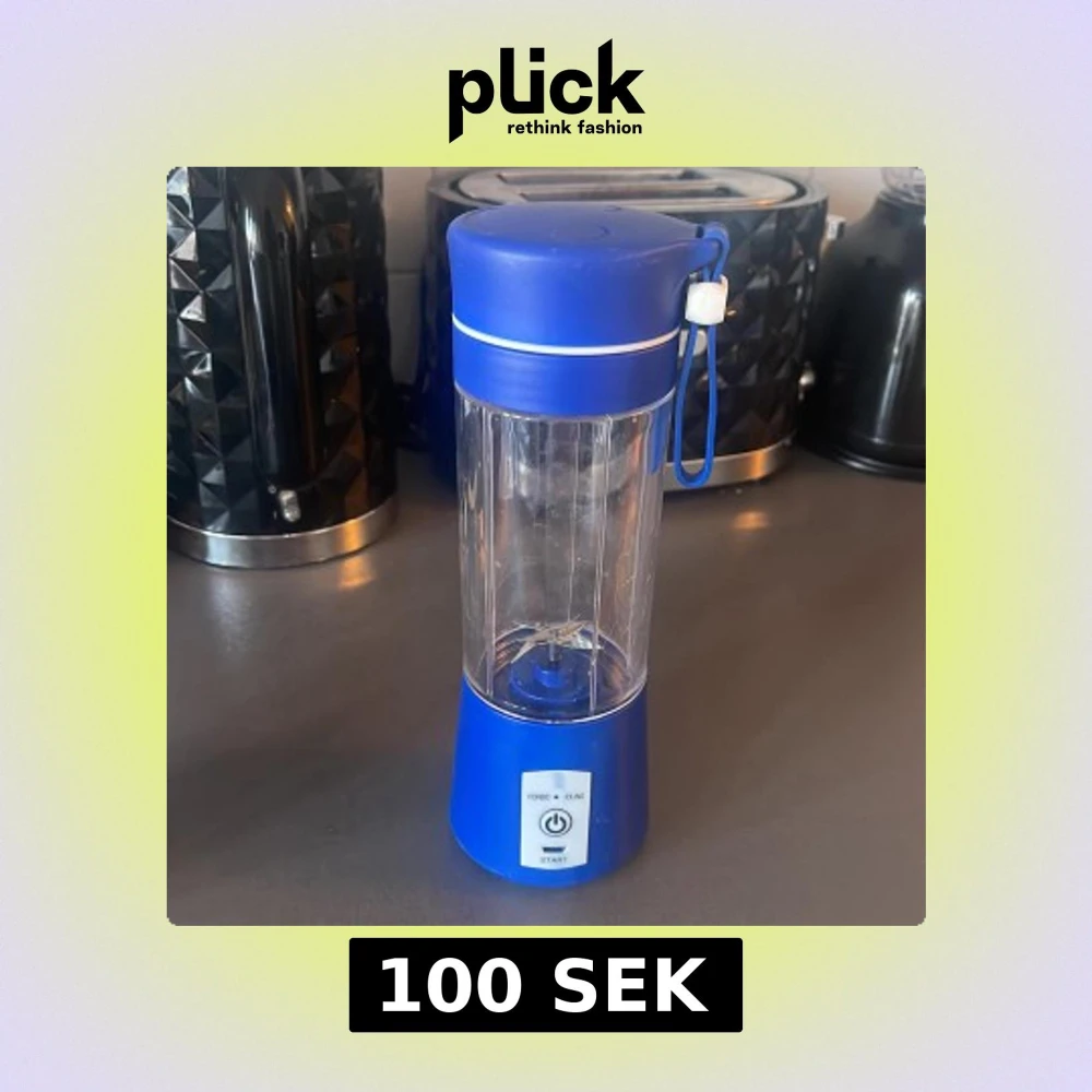 Praktisk bärbar mixer i blått med genomskinlig behållare. Perfekt för smoothies och shakes på språng. Utrustad med en startknapp och en bärrem för enkel transport.
