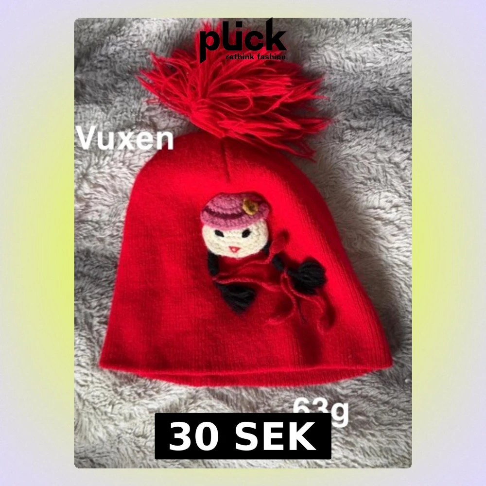 Bilden visar en röd stickad mössa med en stor tofs och broderad docka framtill. 🌸Fint använt skick. För vuxen