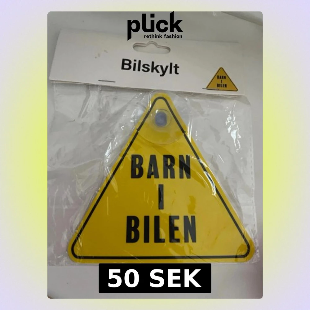 Triangelformad gul bilskylt med svart text 'BARN I BILEN'. Skylten är tillverkad i plast och har en sugpropp för enkel montering på insidan av bilrutan. Perfekt för att visa att det finns barn i bilen.