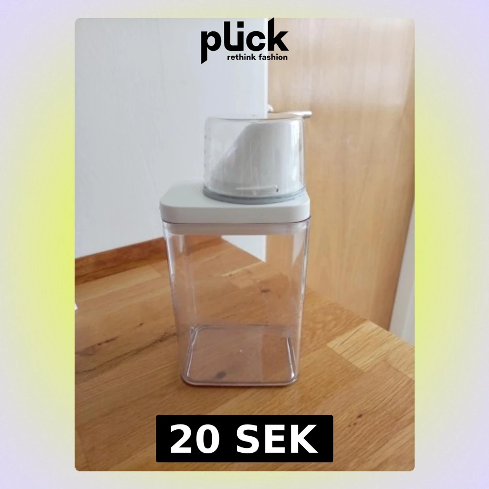Transparent förvaringsburk i plast med vitt lock och tillhörande måttbägare på toppen. Måttbägaren har tydliga röda markeringar för ml och cups, perfekt för att mäta upp tvättmedel. Finns nån tejp på den ja int tagit bort men går bort om man vill