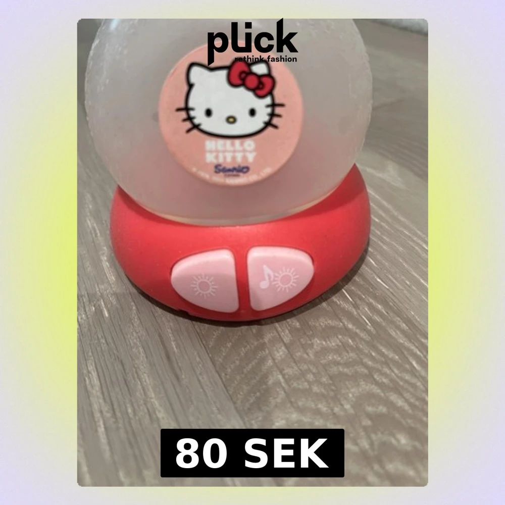 Söt Hello Kitty nattlampa från Sanrio i rosa och vitt. Lampan har två knappar, en med ljussymbol och en med musiknot, vilket gör att den både kan lysa och spela musik. Perfekt för att skapa mysig stämning i rummet.