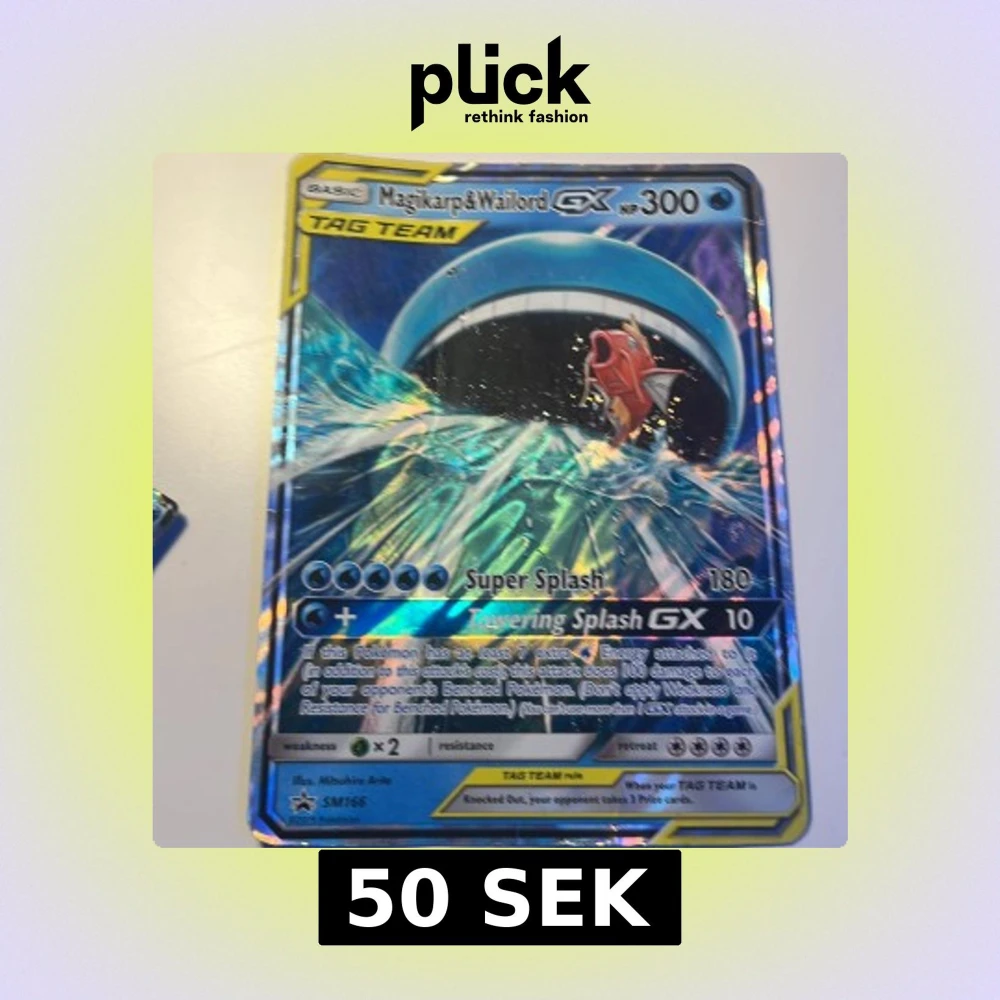 Säljer ett Magikarp & Wailord GX TAG TEAM Pokémonkort med 300 HP. Kortet har en holografisk yta och visar en episk scen med Magikarp och Wailord i vattnet. Perfekt för samlare eller spelare som vill stärka sin kortlek.