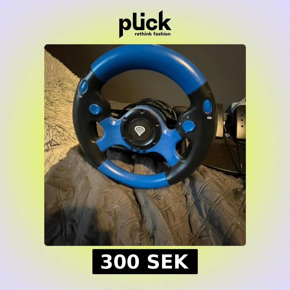 Säljer en blå och svart gamingratt med tillhörande pedaler. Perfekt för bilspel och racing på dator eller konsol. Ratten har flera knappar och en logotyp i mitten. Pedalerna är svarta och kopplas in med kabel.