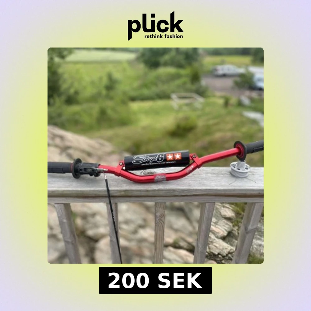 Bilden visar ett rött styre till en moped eller cross, med Stage6-styrcrosskydd och handtag. Ingen bok syns på bilden.
