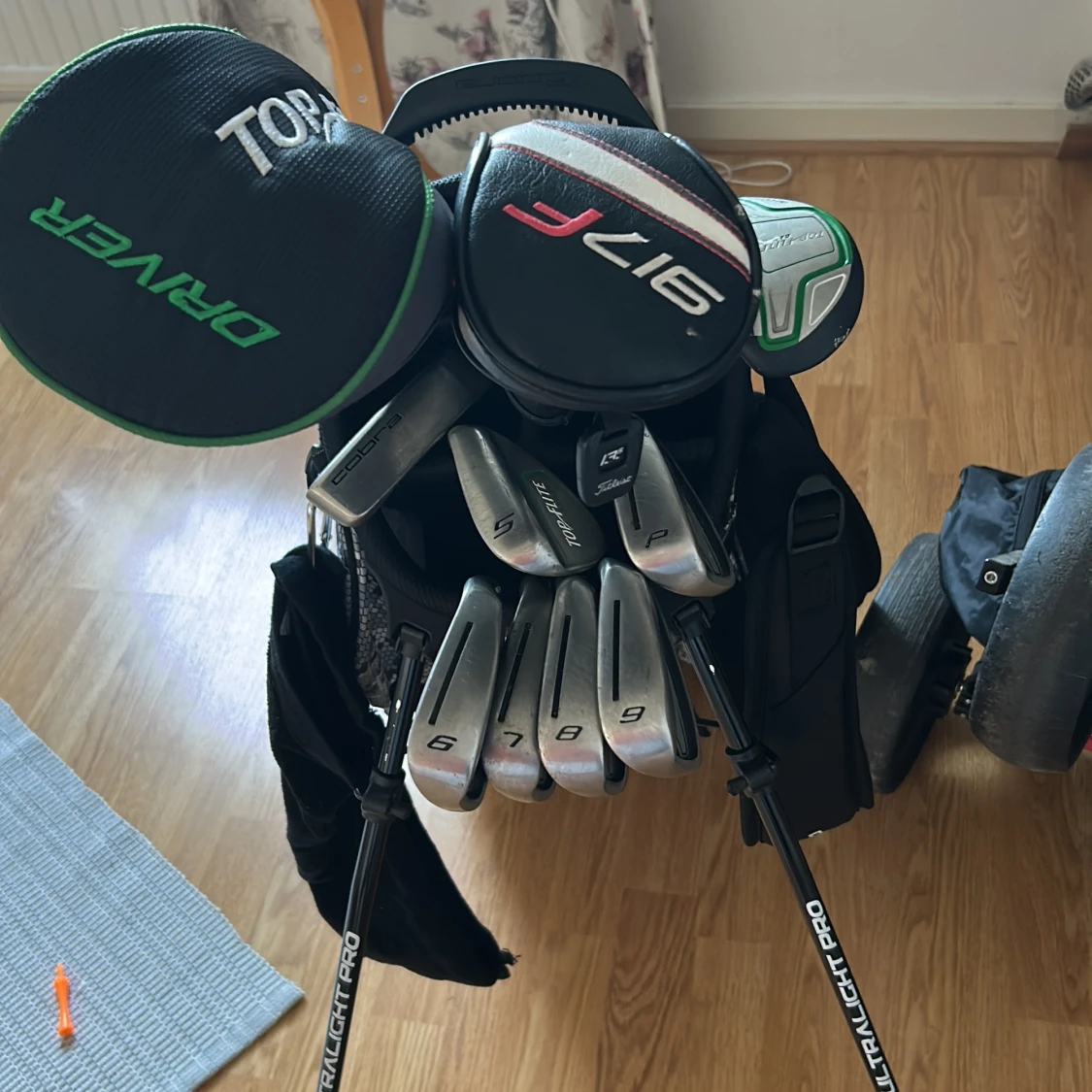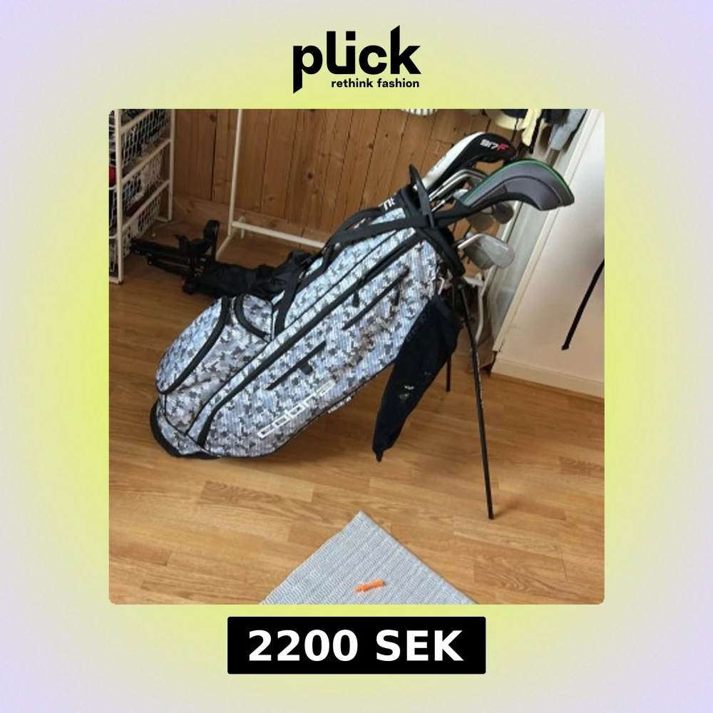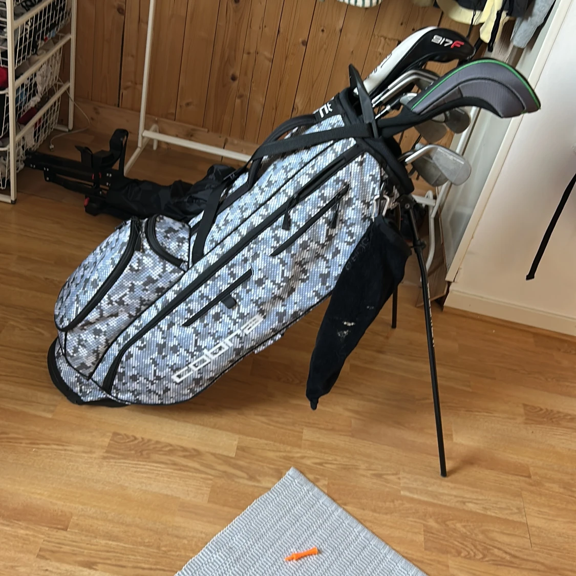 Säljer ett Golfset med grått och vitt camouflagemönster. Väskan har flera fack. Du får köpa bara klubborna om du vill för 1500.