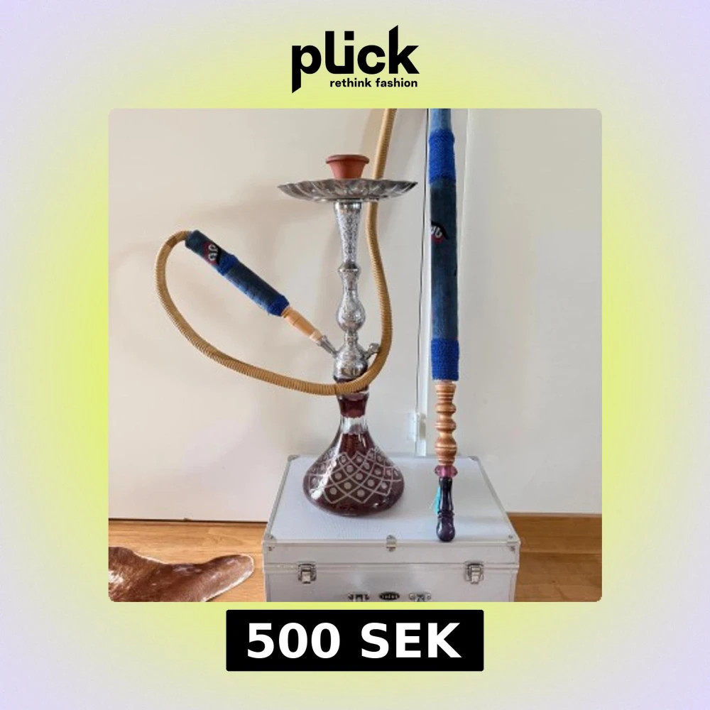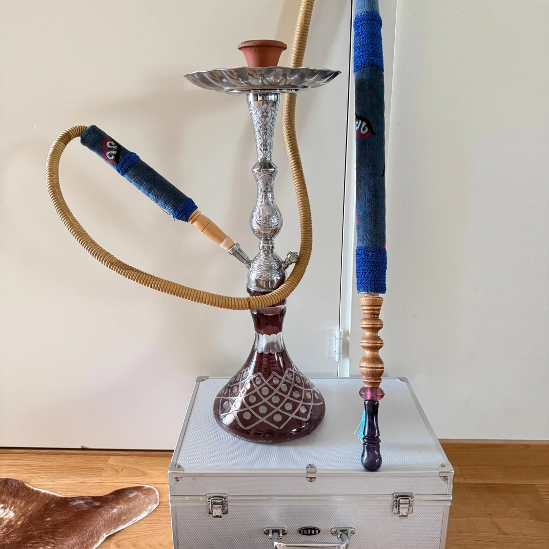 Elegant vattenpipa med en speciell och sällsynt slang, vackert mönstrad glasbas och detaljer i metall. Komplett med keramikskål och tillbehör. Ser ut att vara i mycket gott skick, inga synliga skador eller slitage. Perfekt för sociala tillfällen och avkoppling.