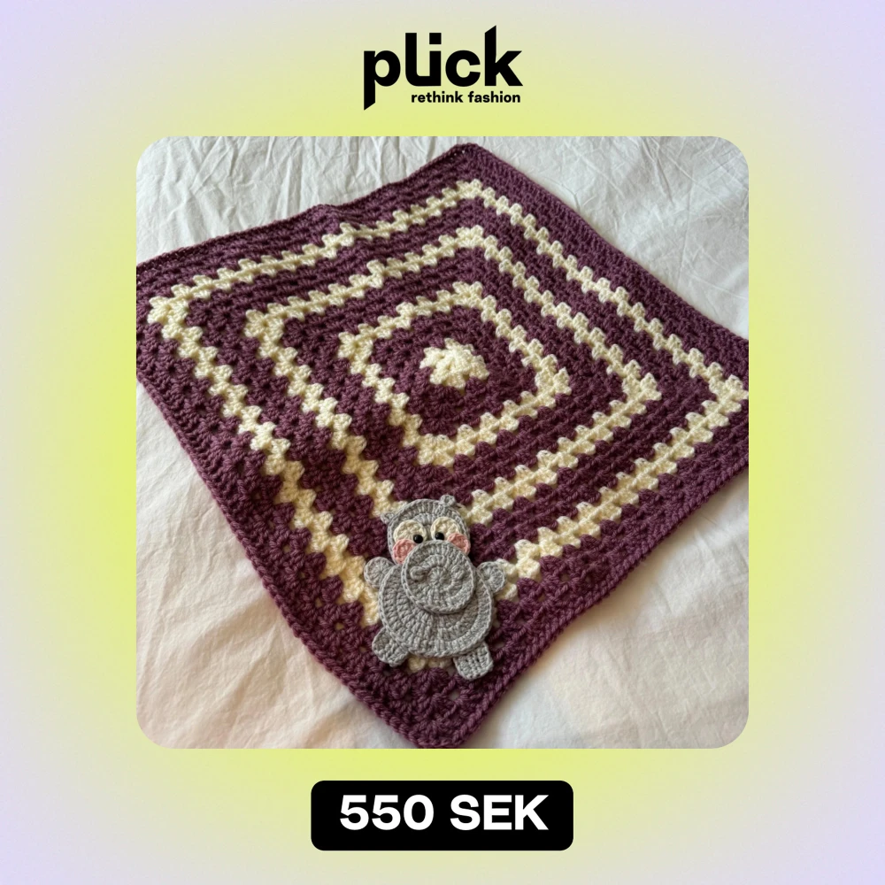 En superfin handgjord virkad filt i lila och beige med ett gulligt flodhästmotiv i hörnet. Perfekt som en mysig detalj i barnrummet eller som en present till en nyfödd. Filten är kvadratisk och har ett härligt mönster som ger en hemtrevlig känsla. 🦛💜virkad i Akrylgarn