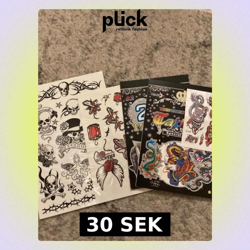 Bilderna visar ark med temporära tatueringar i olika motiv som dödskallar, drakar, örnar och rosor.