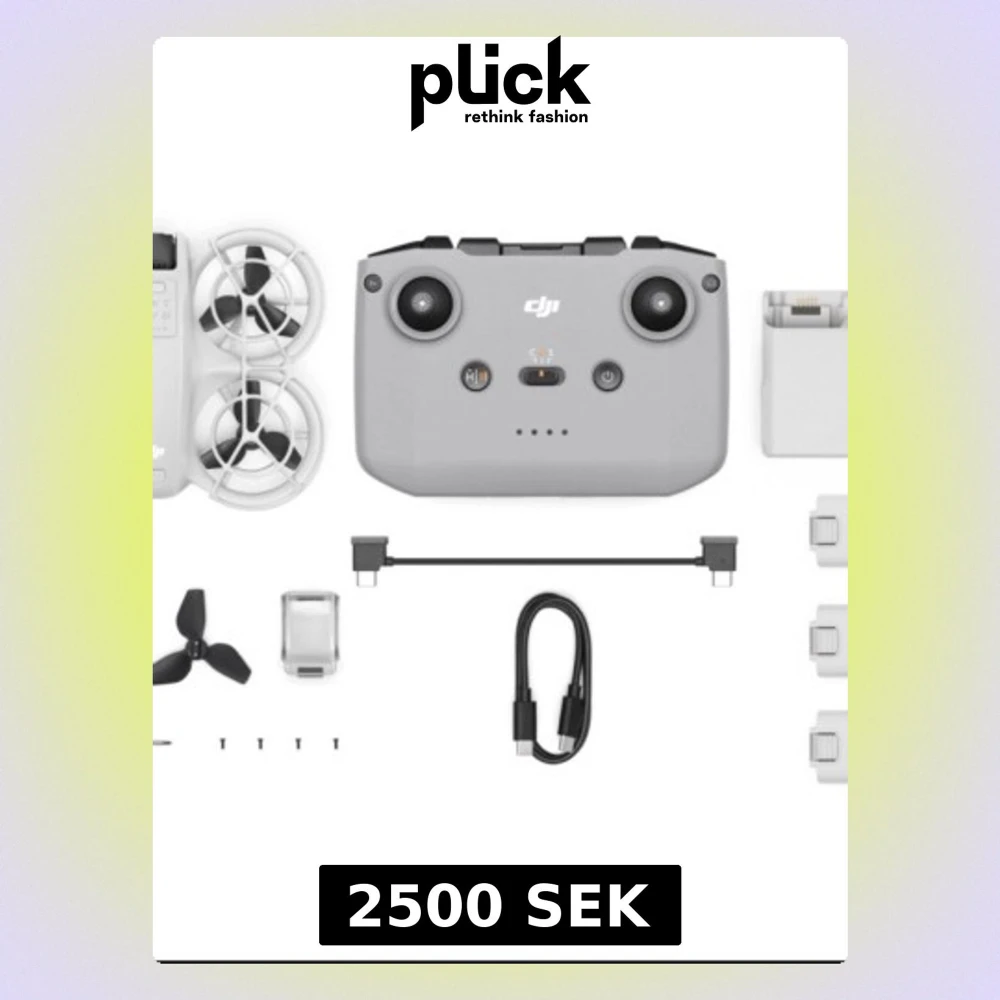 DJI Neo drönare med fjärrkontroll, batteri, skyddsväska och förvaringsväska (en stor för alla skyddsväskor eller en hård väska för bart drönare). Drönaren är utrustad med en propelleraxel och levereras med 3 laddningsbara batterier (färre än 18 laddningscykler) och en fjärrkontroll för styrning. Förvaringsväskan är utformad för att skydda och transportera drönare och deras tillbehör.