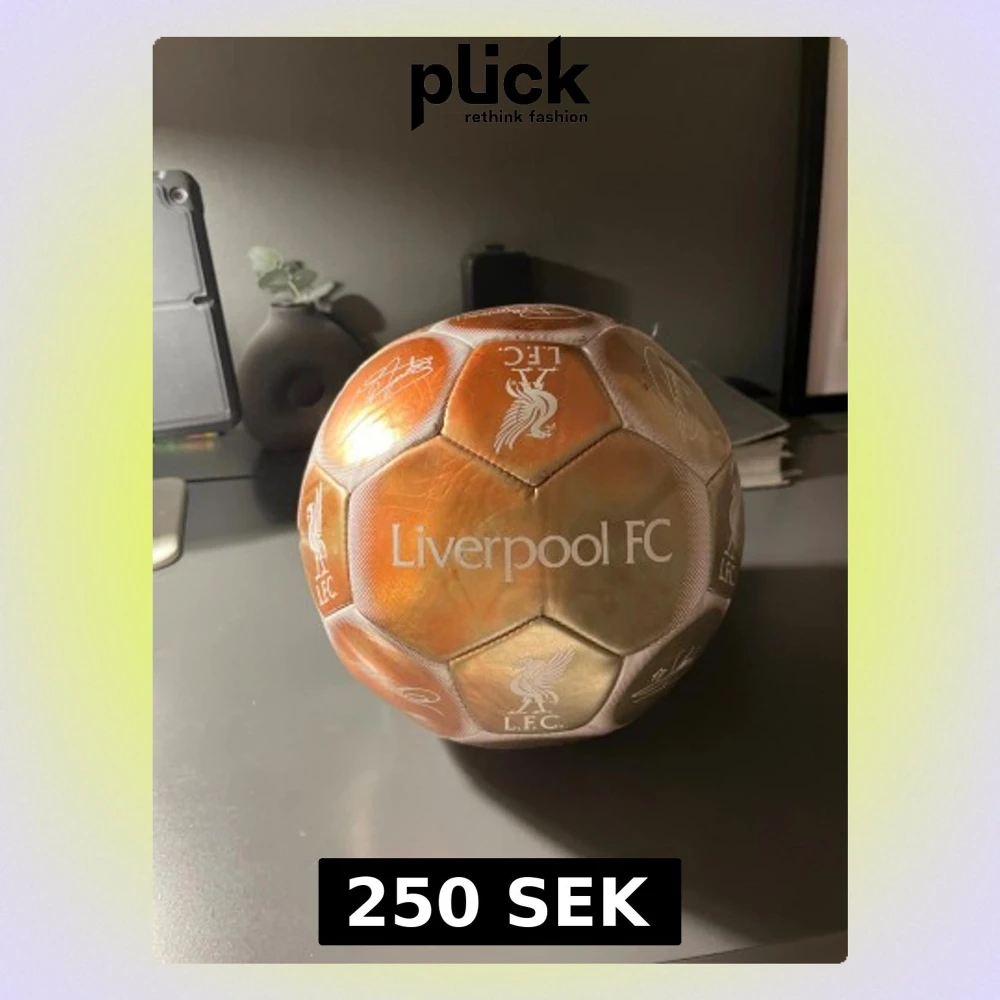 Säljer en riktigt snygg fotboll i guld- och kopparfärg med Liverpool FC-logga och flera tryckta autografer. Bollen har klassisk form med vita detaljer och är perfekt för dig som är ett äkta LFC-fan. Grym att ha som samlarpryl eller dekoration i rummet.