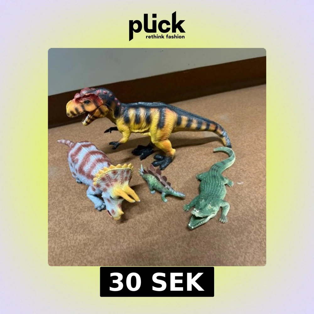 Fyra realistiska plastfigurer: T-Rex, Triceratops, Stegosaurus och krokodil. Färgglada och detaljerade, perfekta för lek eller samling. Alla figurer är i gott skick utan synligt slitage eller skador. 30st