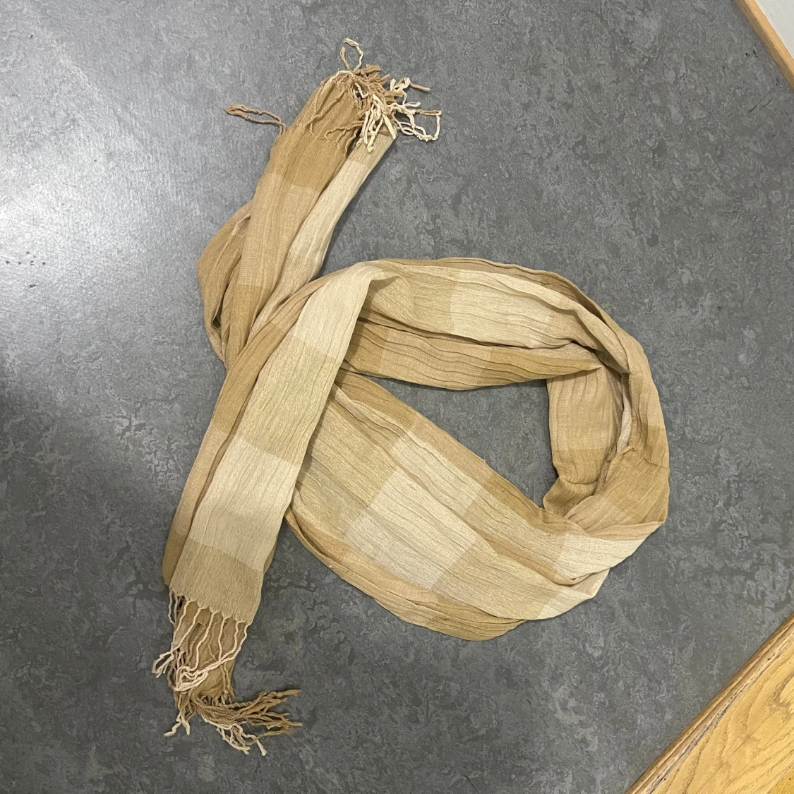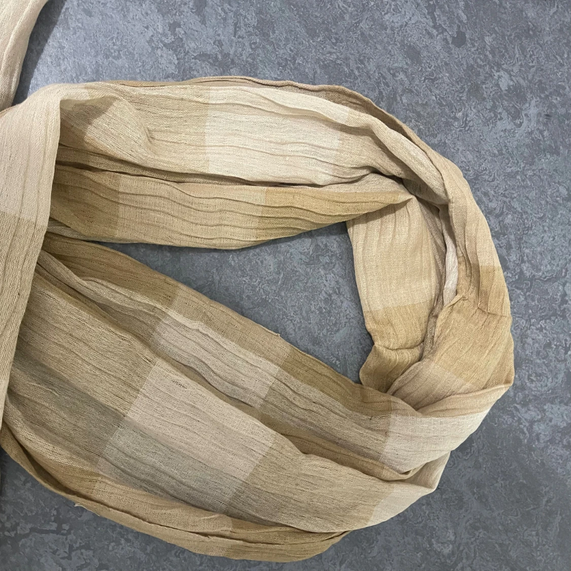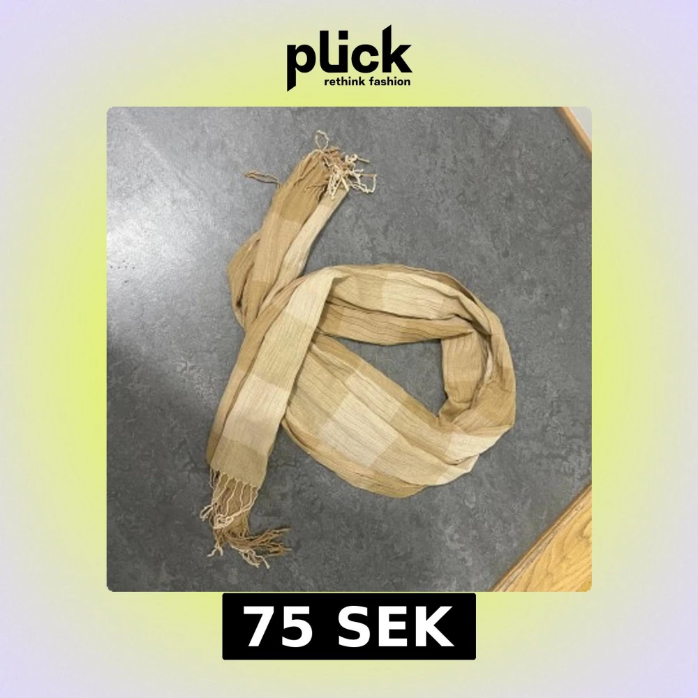 Luftig och lätt halsduk i rutigt mönster med olika nyanser av beige och ljusbrun. Halsduken har tunna, vågiga ränder i tyget och avslutas med fransar i båda ändar. Perfekt accessoar för att lyfta din outfit med en naturlig och stilren look.