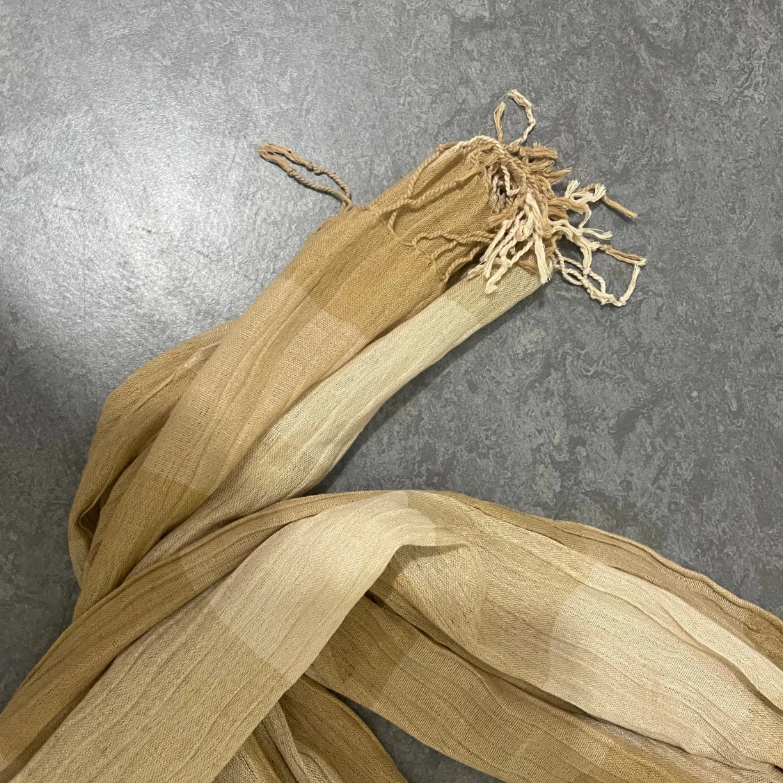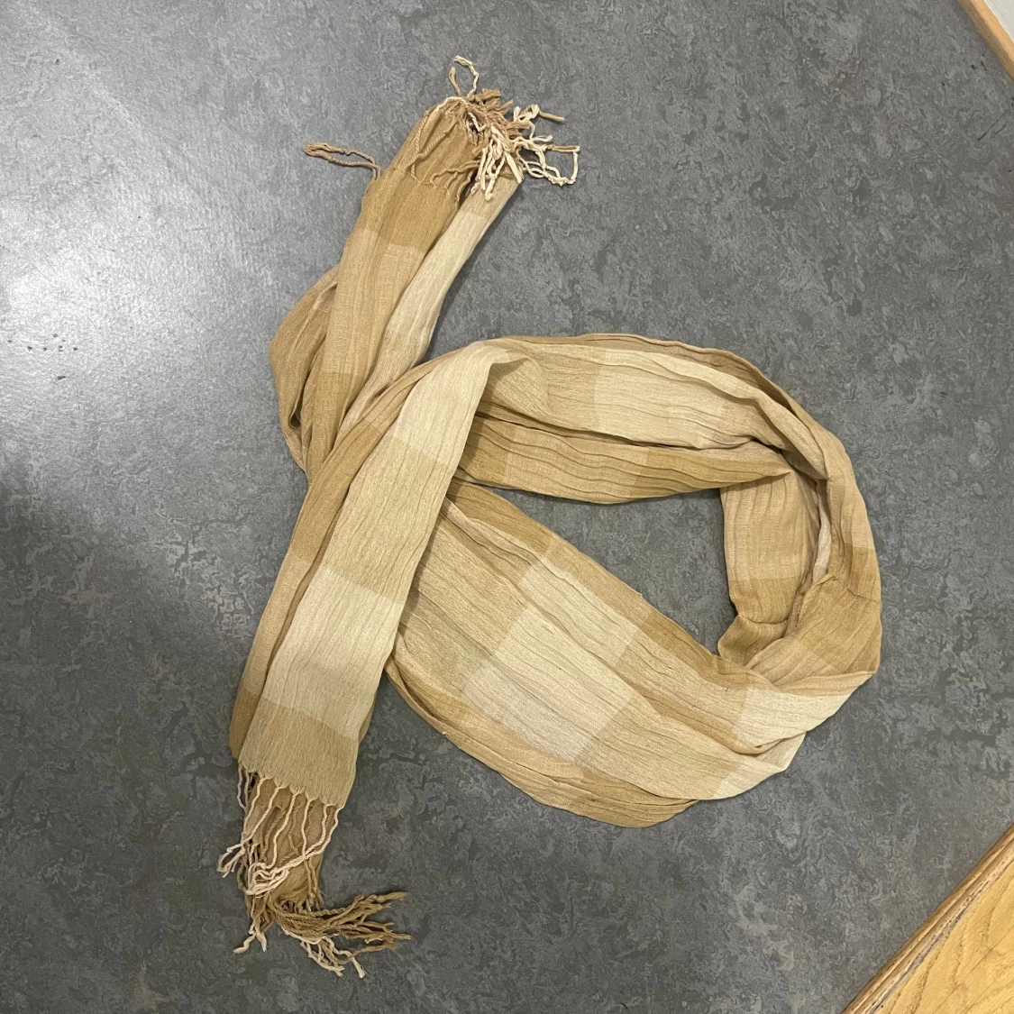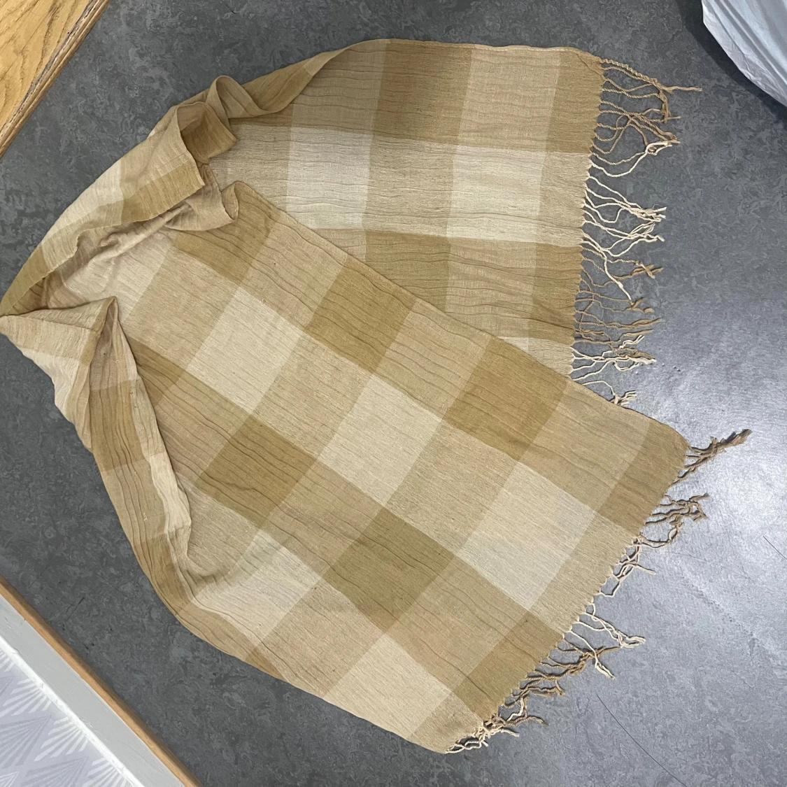 Luftig och lätt halsduk i rutigt mönster med olika nyanser av beige och ljusbrun. Halsduken har tunna, vågiga ränder i tyget och avslutas med fransar i båda ändar. Perfekt accessoar för att lyfta din outfit med en naturlig och stilren look.