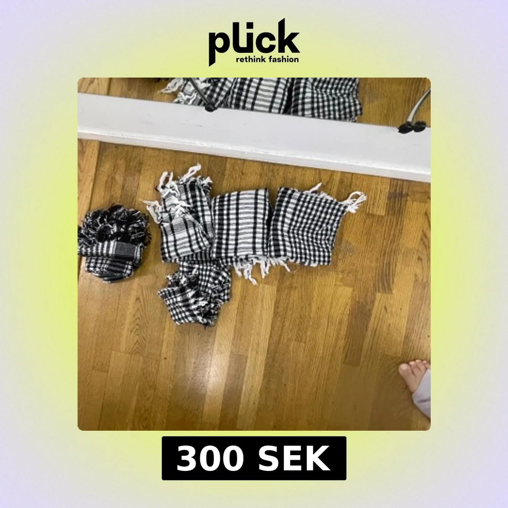 Säljer en svartvit halsduk med klassiskt rutigt mönster och fransar längs kanterna. Halsduken är stor och fyrkantig, perfekt att vira flera varv runt halsen eller bära som sjal. Materialet känns mjukt och lätt, vilket gör den enkel att styla till olika outfits.allt för 300kr eller 75kr styck