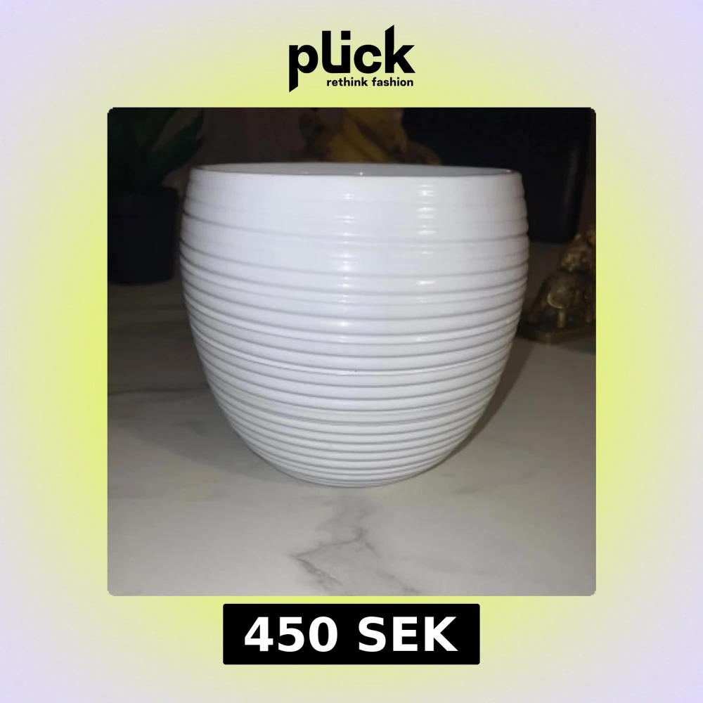 Bilderna visar en vit, glaserad kruka med räfflad yta och en diameter på cirka 15 cm. Krukan är i gott skick utan synliga sprickor eller större skador. Passar utmärkt för inomhusväxter och har en modern, stilren design.