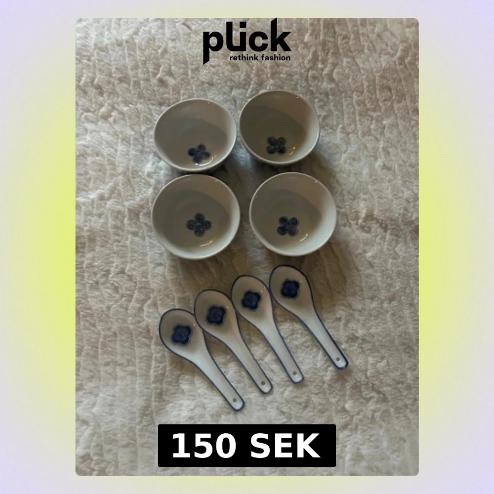 Bilderna visar fyra vita skålar med blått blommönster och fyra matchande skedar.