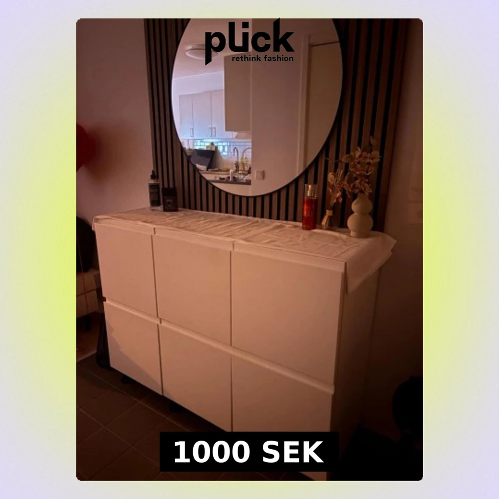Säljer en stilren vit byrå med sex lådor och minimalistisk design. Byrån står på svarta ben och har släta fronter utan handtag. Perfekt för förvaring i hall eller sovrum. Passar in i modern inredning och är lätt att matcha med annan inredning.