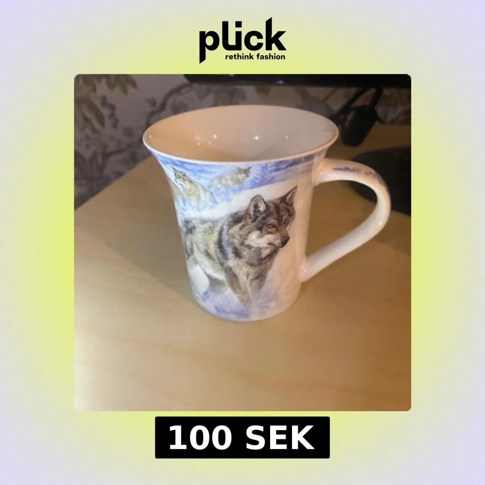 Säljer en vit porslinsmugg med detaljerade illustrationer av vargar i naturmiljö. Muggen har en lätt utsvängd form upptill och ett bekvämt handtag. Perfekt för dig som gillar djurmotiv och vill ha något unikt till köket.