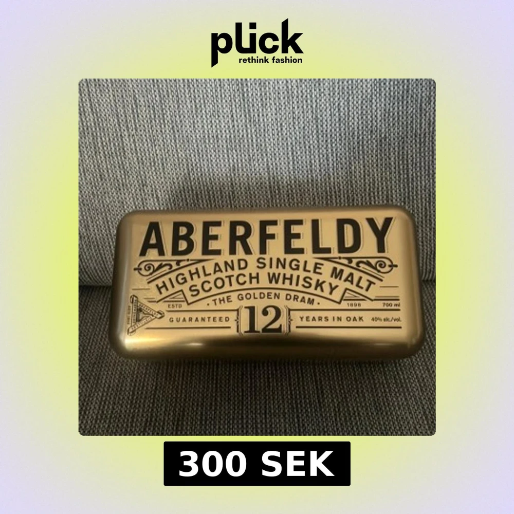 Säljer en snygg presentask i metall från Aberfeldy Highland Single Malt Scotch Whisky, 12 Years in Oak. Asken är guldig med svart text och har plats för en flaska whisky. Perfekt som samlarobjekt eller för att ge bort en exklusiv present. (ÄR BARA LÅDAN)