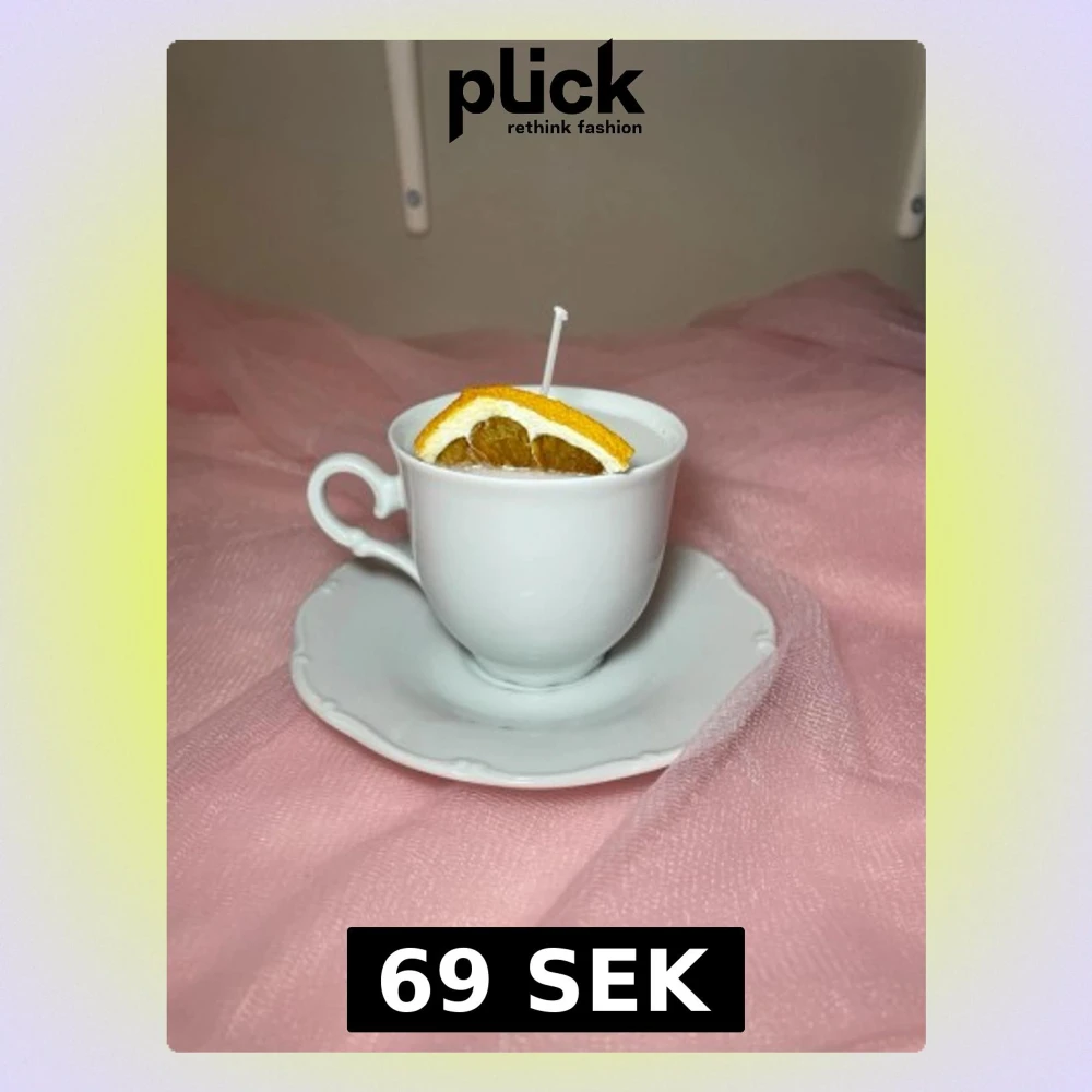 Det här ljuset är gjort av återanvändbara material. Tekoppen är köpt secondhand och stearinet är från kyrkor som tänkte slänga det. Det här ljuset har en svag doft utav vanilj, så känsliga även kan använda det. Det här ljuset har även torkade blommor och apelsin på som dekoration.