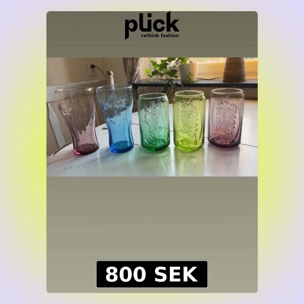 Säljer ett set med fem färgglada Coca-Cola glas i olika nyanser: lila, blå, grön och gul. Glasen har Coca-Cola-loggan i relief och är tillverkade i glas. Perfekta för att göra drycken lite roligare vid middagsbordet eller till samlingen.