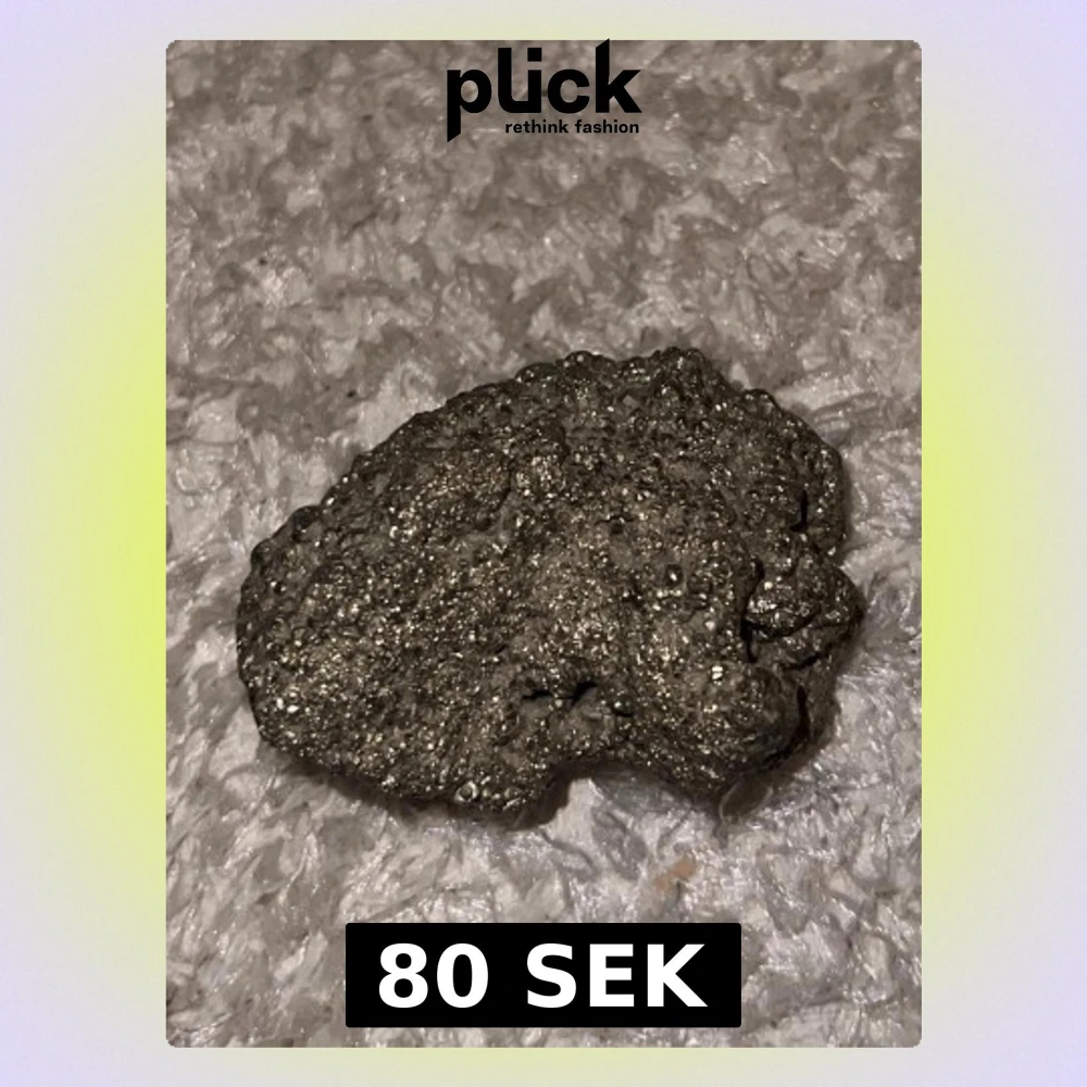 Säljer en rå, glittrande pyritsten med metallisk yta och oregelbunden form. Stenen har en skimrande guldaktig färg och är perfekt för dig som samlar mineraler eller gillar unika dekorationer. Pyrit är även känd som 'fool's gold' och är riktigt snygg i hyllan.